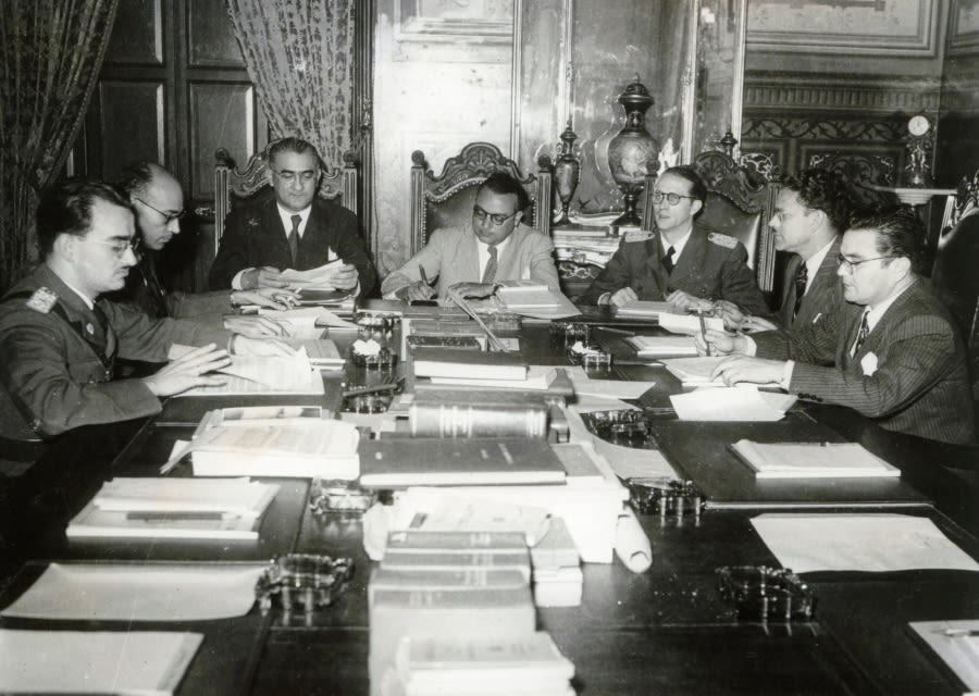 Miembros del gabinete ejecutivo de la Junta de Gobierno de 1945, de izquierda a derecha se encuentran entre otros: Pedro Acosta Oropeza, Luis Lander, Leopoldo Martínez Olavarría, Germán Herrera Umerez, Manuel Pérez Guerrero, Edgar Pardo Stolk, Juan Pablo Pérez Alfonzo, Edmundo Fernández, Raúl Leoni, Jesús María Herrera Mendoza, un invitado al Palacio de Miraflores, Samuel Belloso y Ángel Cervini | Archivos de Foto Galería Caracas