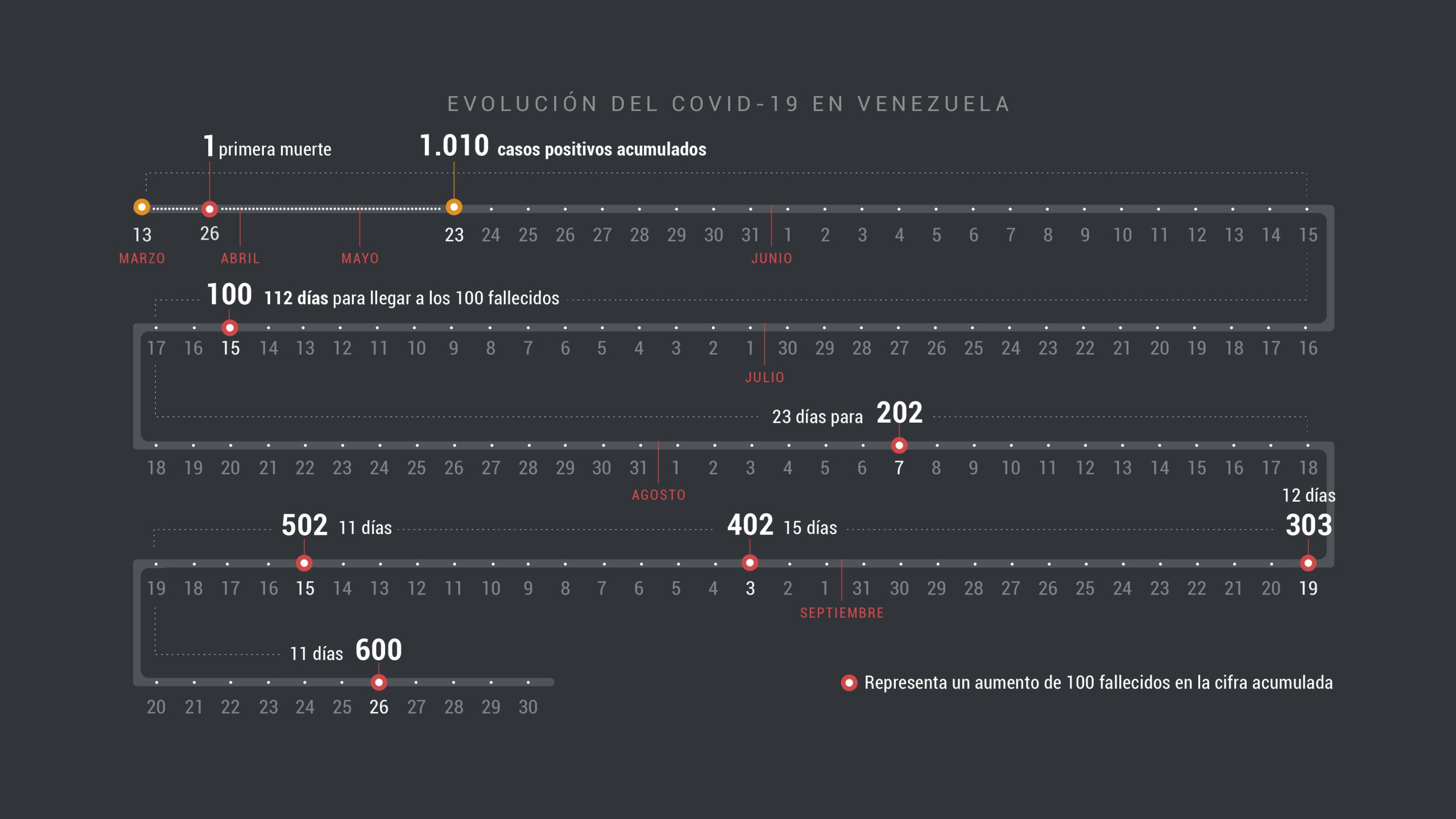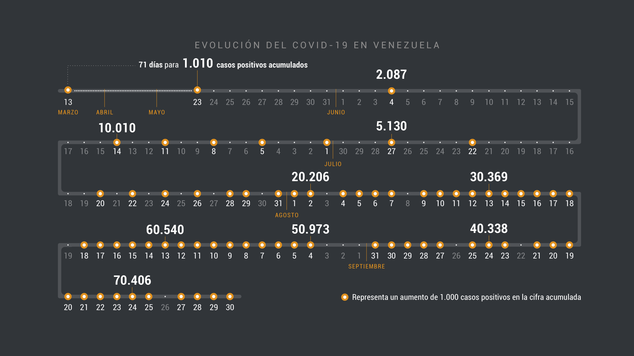 Venezuela había mostrado hasta el momento cifras más bajas que las de varios países de Latinoamérica, con 1.510 positivos y 14 fallecidos al cierre de mayo, mes en el que se registró el único día con mayor cantidad de casos positivos anunciados (131 el 19 de mayo) y solo hubo decesos durante nueve días desde el inicio de la cuarentena.