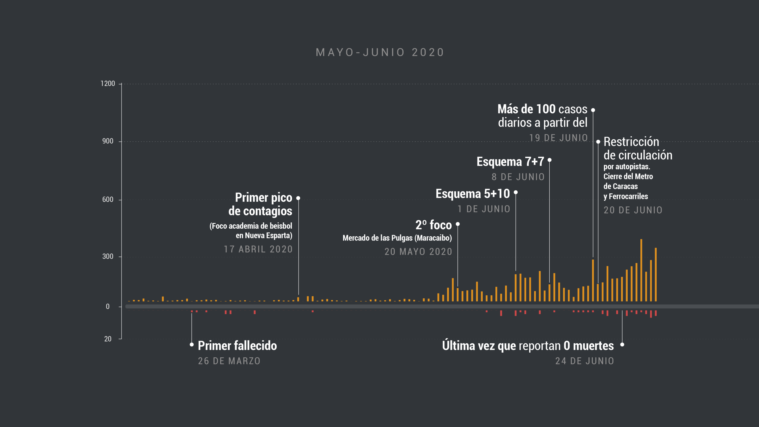 Con 1.459 casos detectados y 14 fallecidos, el segundo semestre del año inició con la activación de un esquema de flexibilización propuesto por el gobierno de Nicolás Maduro para lograr una “normalidad relativa” que permitiera impulsar la economía. Alternar las restricciones con la relajación de las medidas era “una necesidad para la vida familiar, para la vida social y para reactivar sectores importantes, sectores económicos”, según el mandatario.