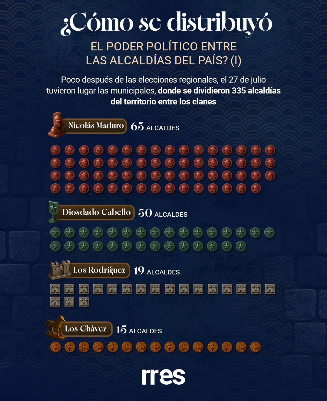 Esta investigación revisó los perfiles y determinó la conexión de los gobernadores y alcaldes a los clanes políticos que sostienen y controlan el alto gobierno, que son: la pareja presidencial, con Nicolás Maduro y Cilia Flores al mando de la jefatura del Estado; los Cabello, con el ministro de Relaciones Interiores, Justicia y Paz, Diosdado Cabello al frente; los hermanos Delcy (vicepresidenta de la República) y Jorge Rodríguez (presidente de la Asamblea Nacional); y Vladimir Padrino López, ministro de la Defensa, cuyas fichas no están puestas en gobernaciones y alcaldías sino en el ala militar que comanda.