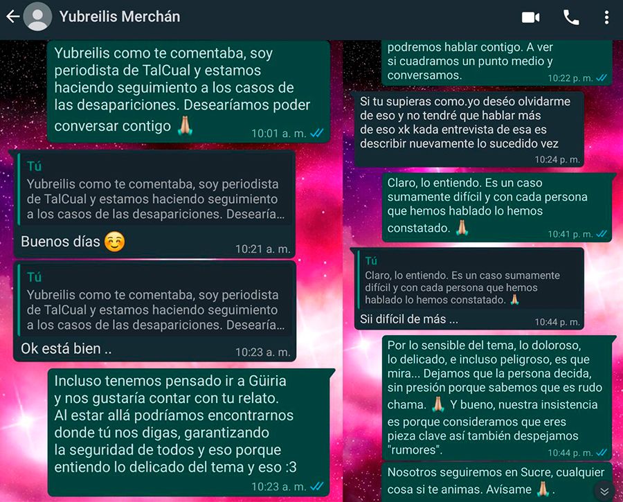 On Thursday, April 18, at 4:00 p.m., Ana received another call. Someone who identified herself as Luisiannys told her she was on the border with Colombia. She was crying. "Mom, I'm on speakerphone. Better write me." Through text messages she explained that she wanted to go back home, but they wouldn't let her. "They are charging me $200 to leave because that's what they spent on me," she said. The girl didn't say where she was and then stopped writing. Similar messages arrived the next day.