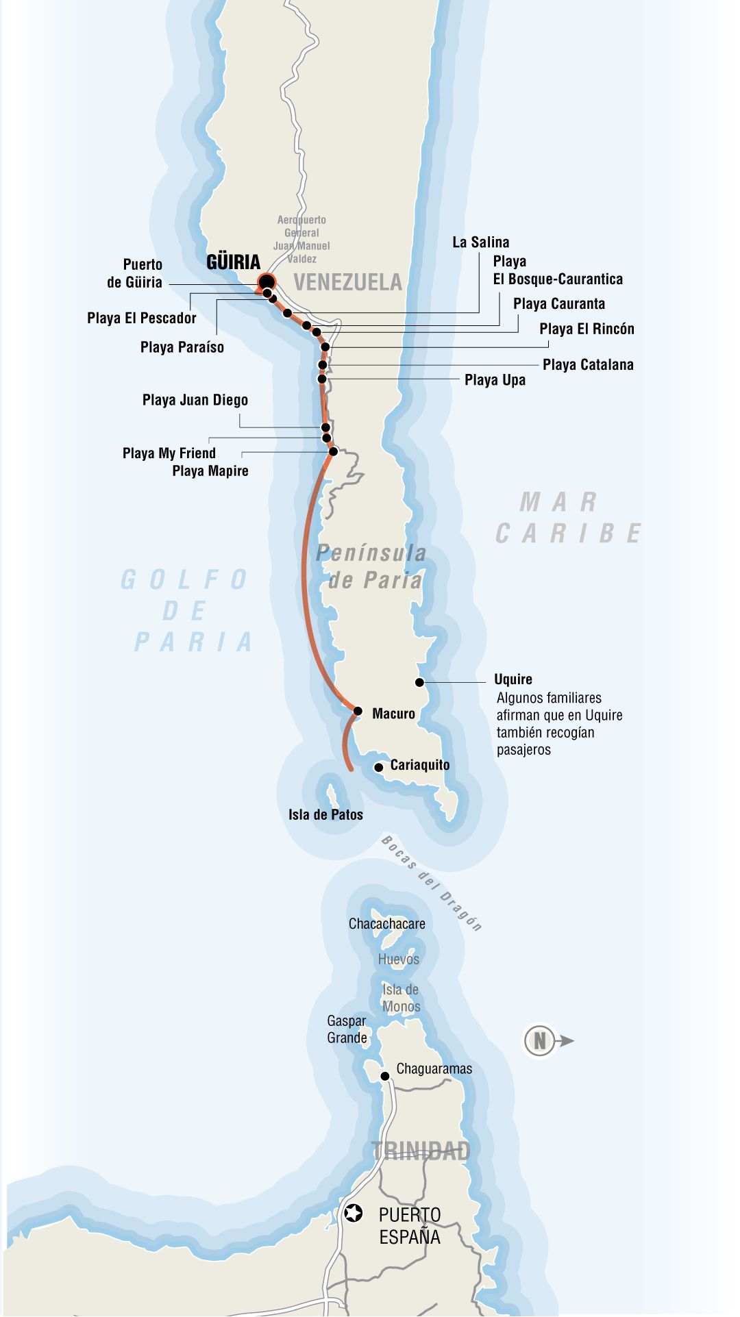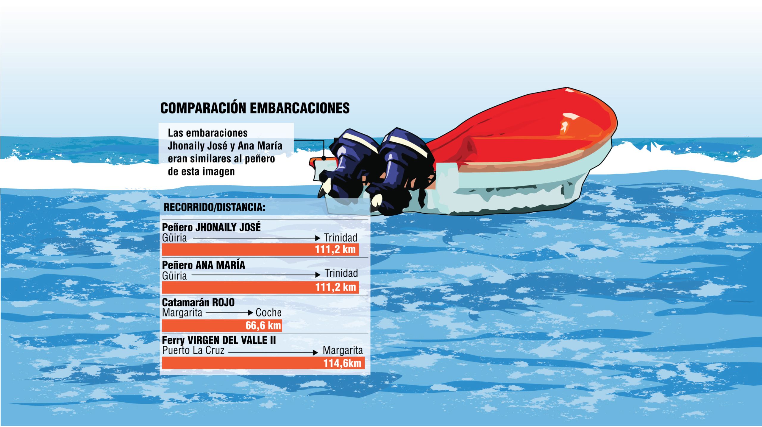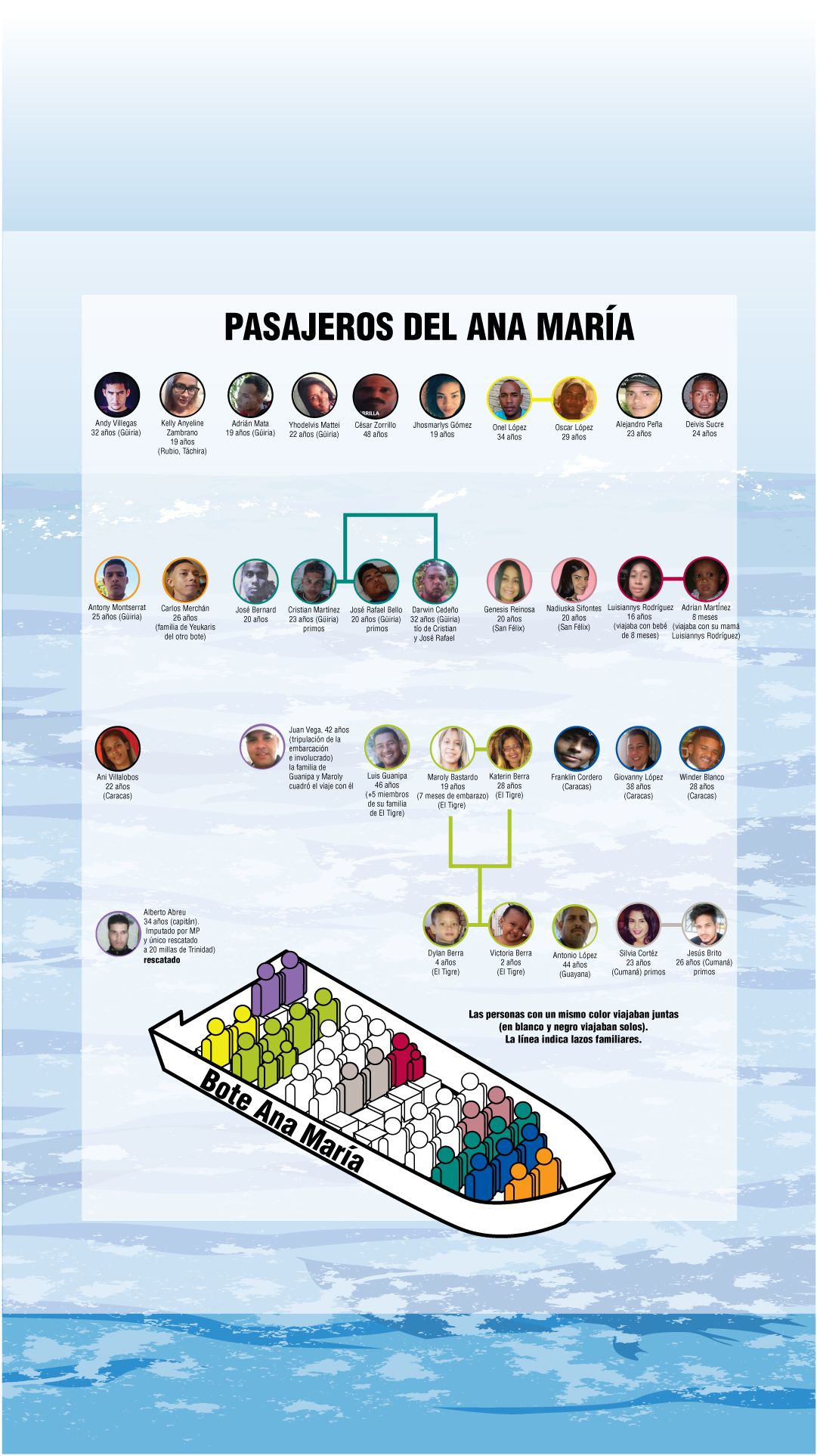 The boat Ana María, skippered by Alberto Abreu, left from pier No. 8 in Güiria at 4:00 in the afternoon on 16 May 2019. Authorities have not shown the official list with the travel protocol that authorized the departure of the Ana María to know who was in charge of the boat, according to the Port Captain's Office, but relatives agree that Abreu was not originally the captain, but took over the boat in a last minute change. They also know who the four initial passengers were because they called their relatives before leaving and notified their location: Silvia Cortés, Jesús Brito, Andy Villegas and Yodelvis Mattei, the only one without a passport.