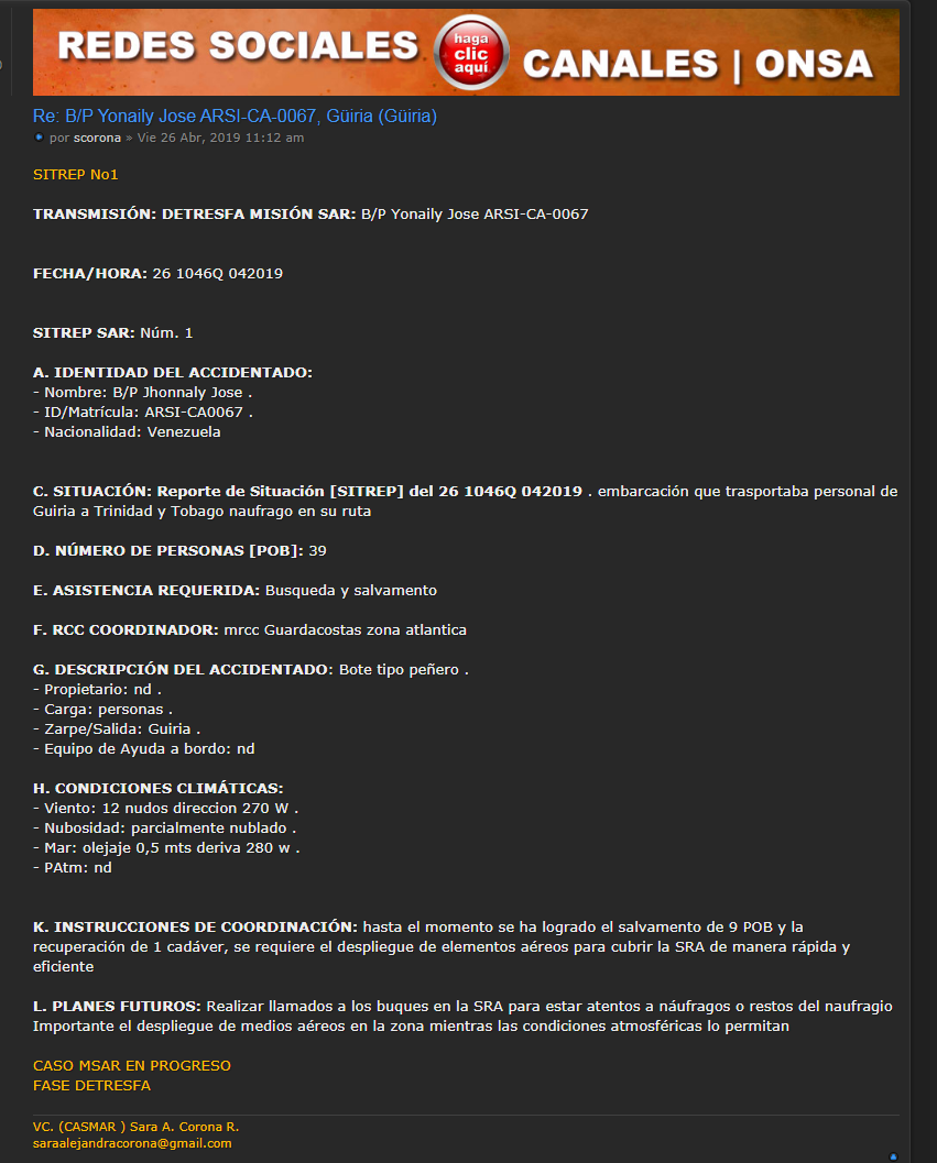 The ONSA website records the first minute issued by the National Guard on the Jhonaily José boat (onsa.org.ve)
