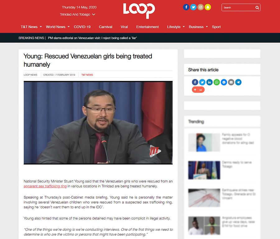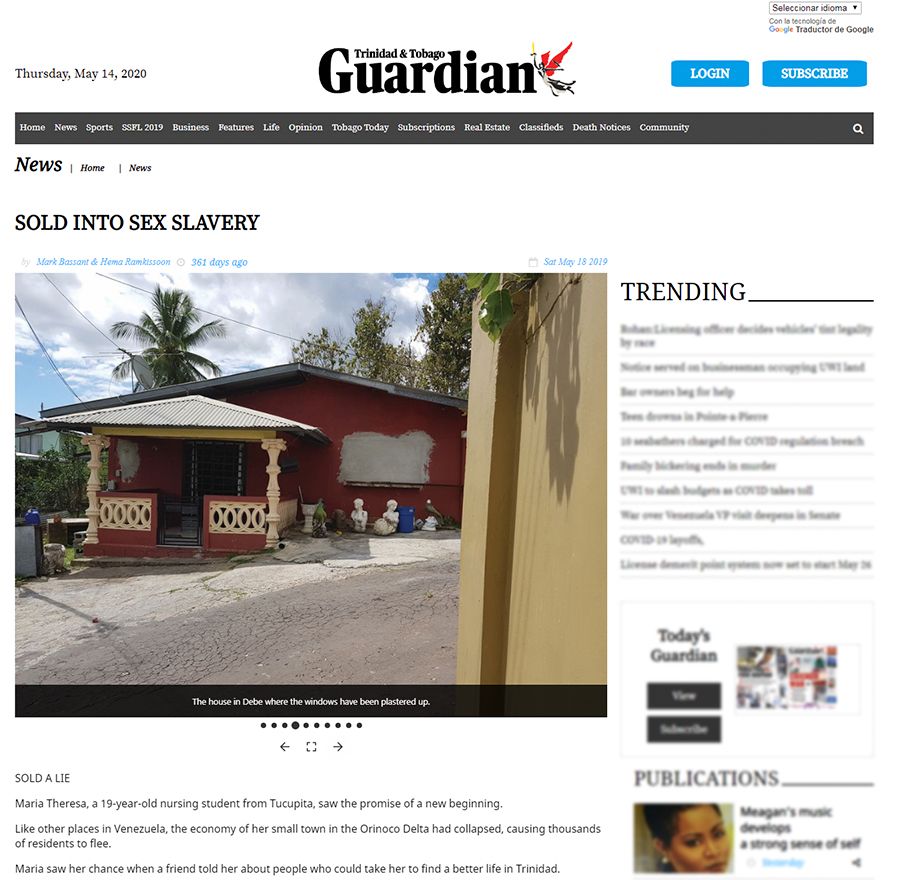 A three-month investigation published in May 2019 by journalists Mark Bassant and Hema Ramkissoon of the Trinidad & Tobago Guardian revealed how human traffickers took advantage of the migration context to target teenagers and Venezuelan women seeking economic survival.