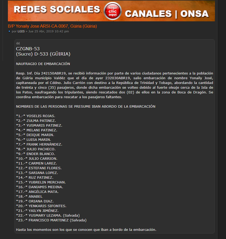 "Information was received from several citizens belonging to the population of Güiria, municipality of Valdéz, that yesterday (April 23), a boat named Yonaily José, captained by the Cddno, left. Julio Carrión with destination to the Republic of Trinidad and Tobago, boarding the amount of thirty-five (35) passengers, where the boat turned due to the strong waves near the Isla de los Patos, wrecking the crew, being rescued two (02) of them in the area of Boca de Dragón. The boat is being coordinated to rescue the missing passengers", says the minute.