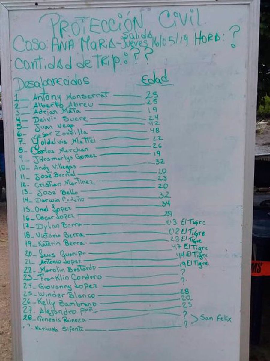 List of missing persons of the Ana María exposed at the Güiria dock (Twitter @carlosvalero08)