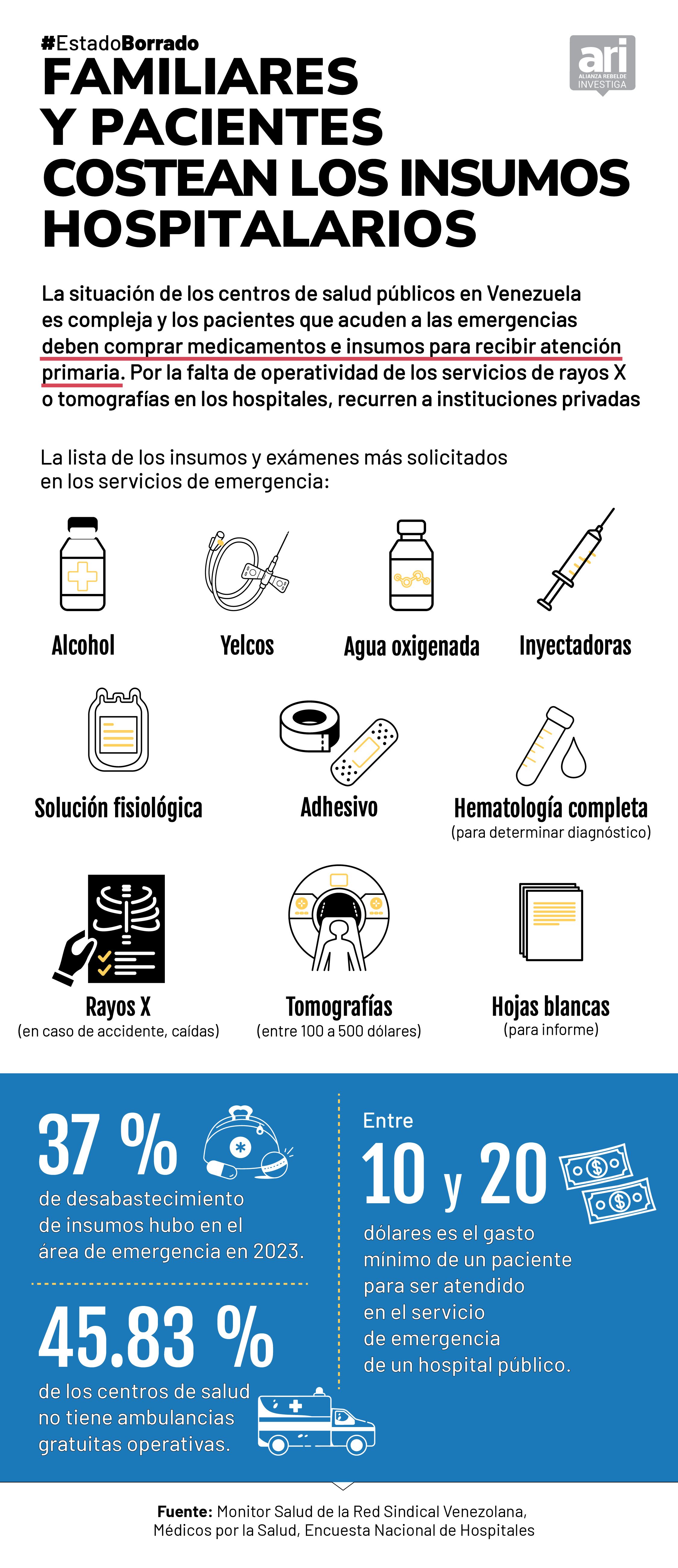 La escasez de insumos en el sistema de salud pública de Venezuela es de larga data. En septiembre de 2002, la Federación Médica Venezolana (FVM) interpuso una acción de amparo en la Sala Constitucional del Tribunal Supremo de Justicia (TSJ) en contra de los titulares del entonces Ministerio de Salud y Desarrollo Social y del IVSS por las fallas de dotación de materiales, equipos y acondicionamiento en hospitales de Distrito Capital y los estados Anzoátegui, Barinas, Carabobo, Cojedes, Delta Amacuro, Falcón, Lara, Miranda, Táchira y Zulia. Diez años después de esta advertencia del gremio médico, el sistema de salud pública entró en colapso. En 2023 se reportó una inoperatividad entre 70 % y 90 % en los servicios de hospitales, ambulatorios y otros centros, de acuerdo con estimaciones del Programa Venezolano de Educación-Acción en Derechos Humanos (Provea).