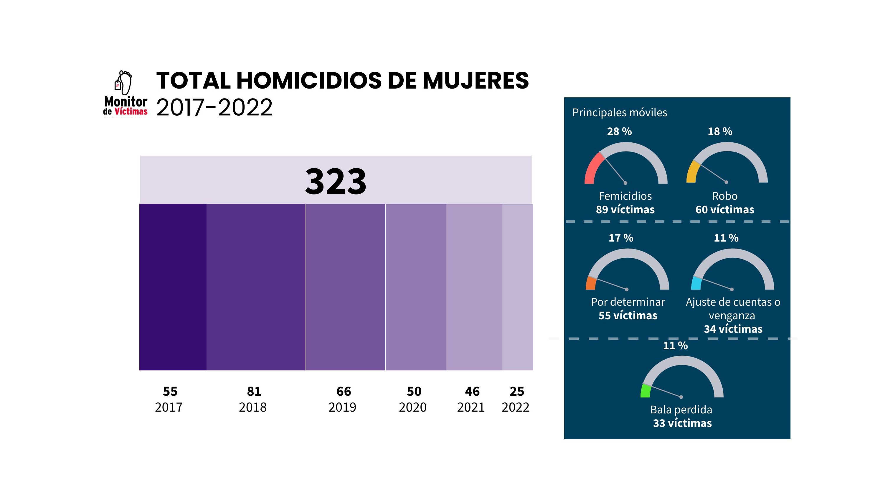 Lo que llama la atención de las muertes según género es que los casos de las mujeres han ido aumentando, poco a poco, su participación en estas estadísticas a lo largo del período de tiempo estudiado, pasando de representar el 5% del total de muertes en el año 2018 a 8% en 2022. Aunque estadísticamente pudiera parecer un dato menor, la realidad es que contrasta con la disminución constante de los homicidios desde 2019.