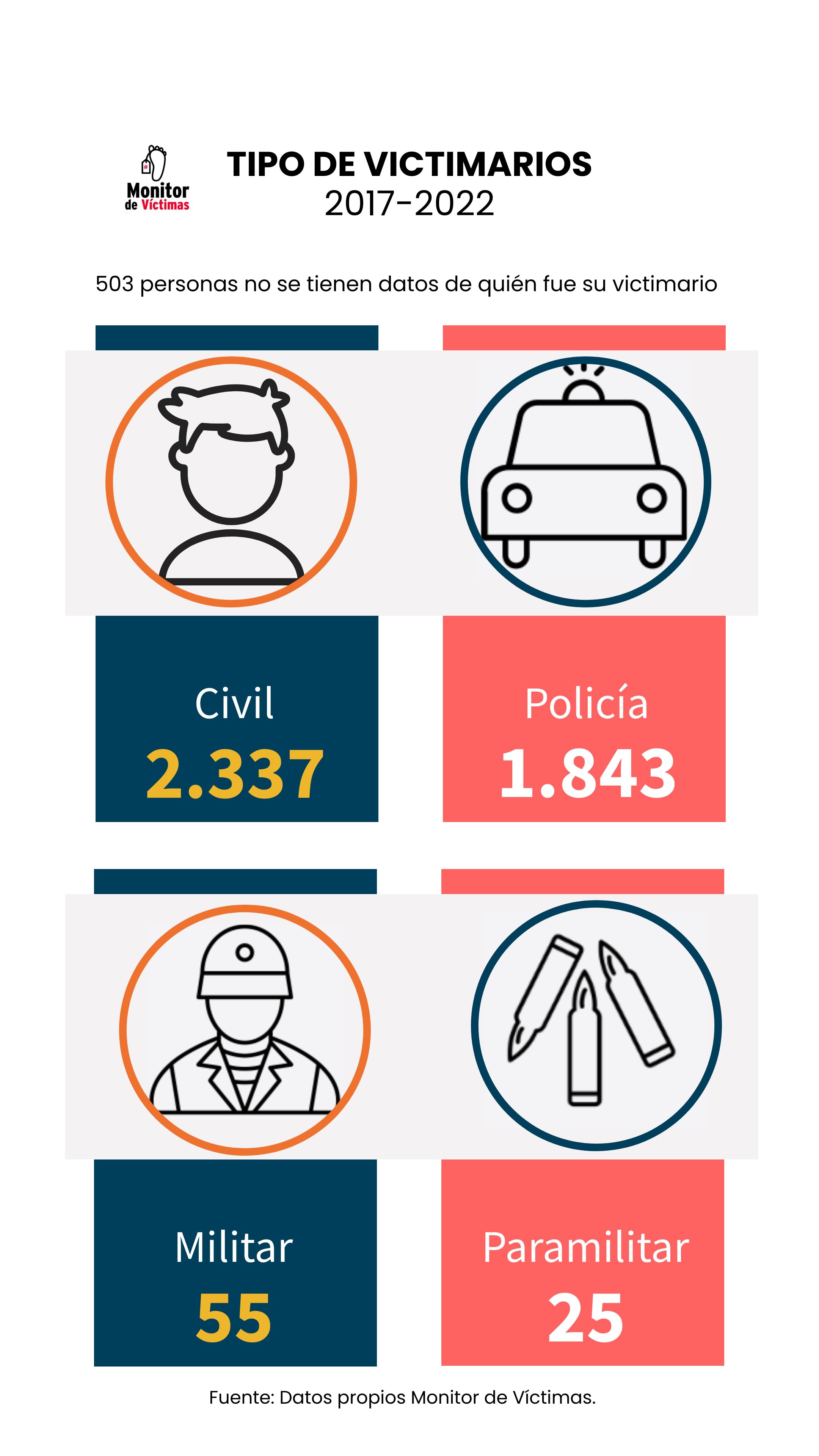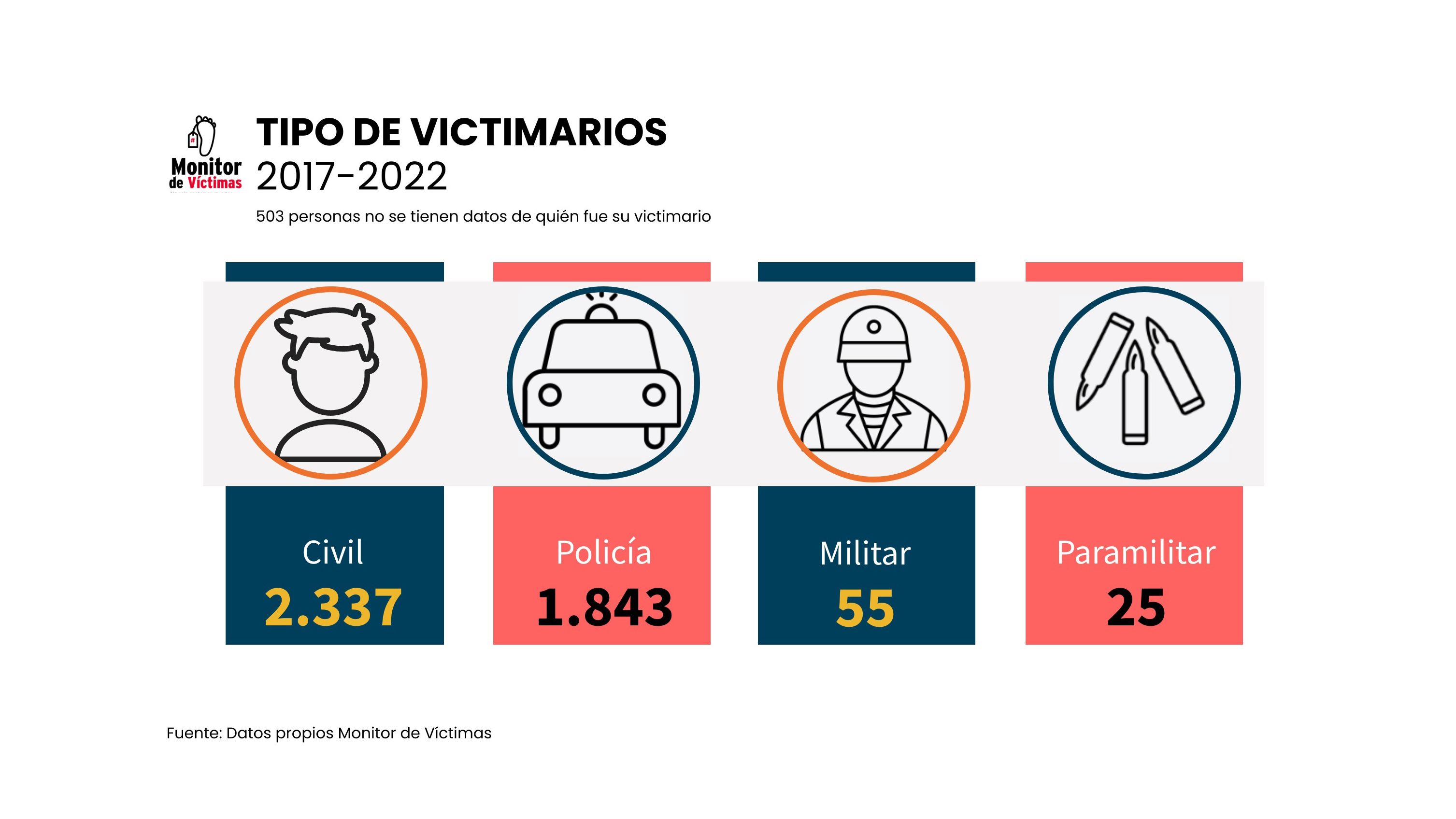 Finalmente, se tiene que, en promedio, que 96% de las personas fallecidas por causas violentas eran civiles. Y, en el caso de las personas victimarias, se tiene que una disminución del 26% entre 2018 y 2022 en cuanto a la incidencia de funcionarios en las muertes. Sin embargo, este dato debe ser tomado con pinzas debido a que el porcentaje de no respuesta por parte de los/as familiares en esta categoría aumentó en el último año.