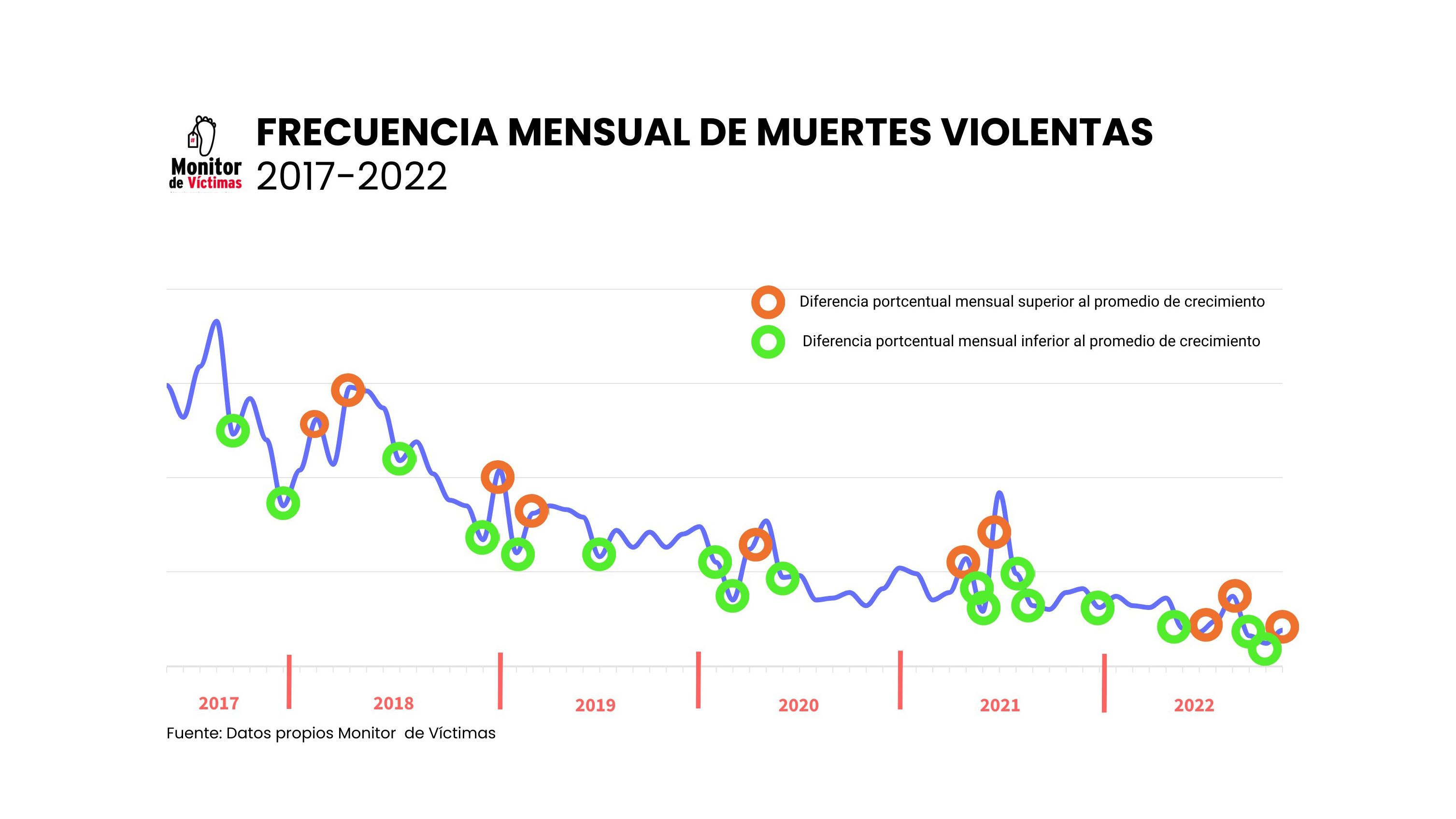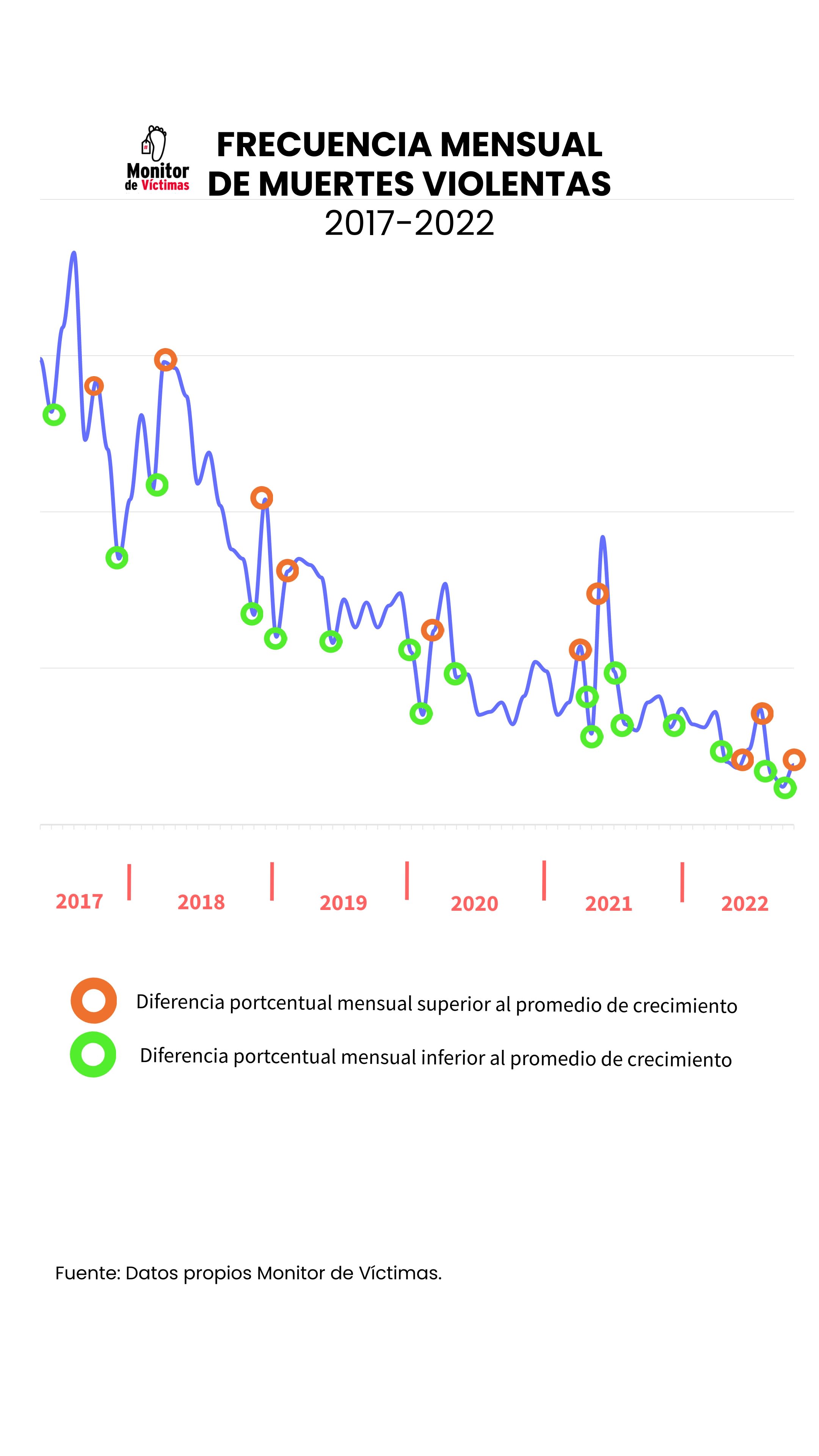 Al poner la lupa sobre estas variaciones en el tiempo de las muertes registradas por Monitor de Víctimas en Caracas se pueden observar momentos de aumentos o disminuciones importantes en el número de homicidios. Para ello, se puede observar el gráfico , en donde se tiene la frecuencia mensual del número de personas fallecidas por causas violentas a lo largo de los años estudiados; y allí, se han señalado aquellos momentos en los que, la diferencia porcentual de un mes al siguiente sea mayor al promedio del aumento o la disminución registrados entre 2017 y 2022.