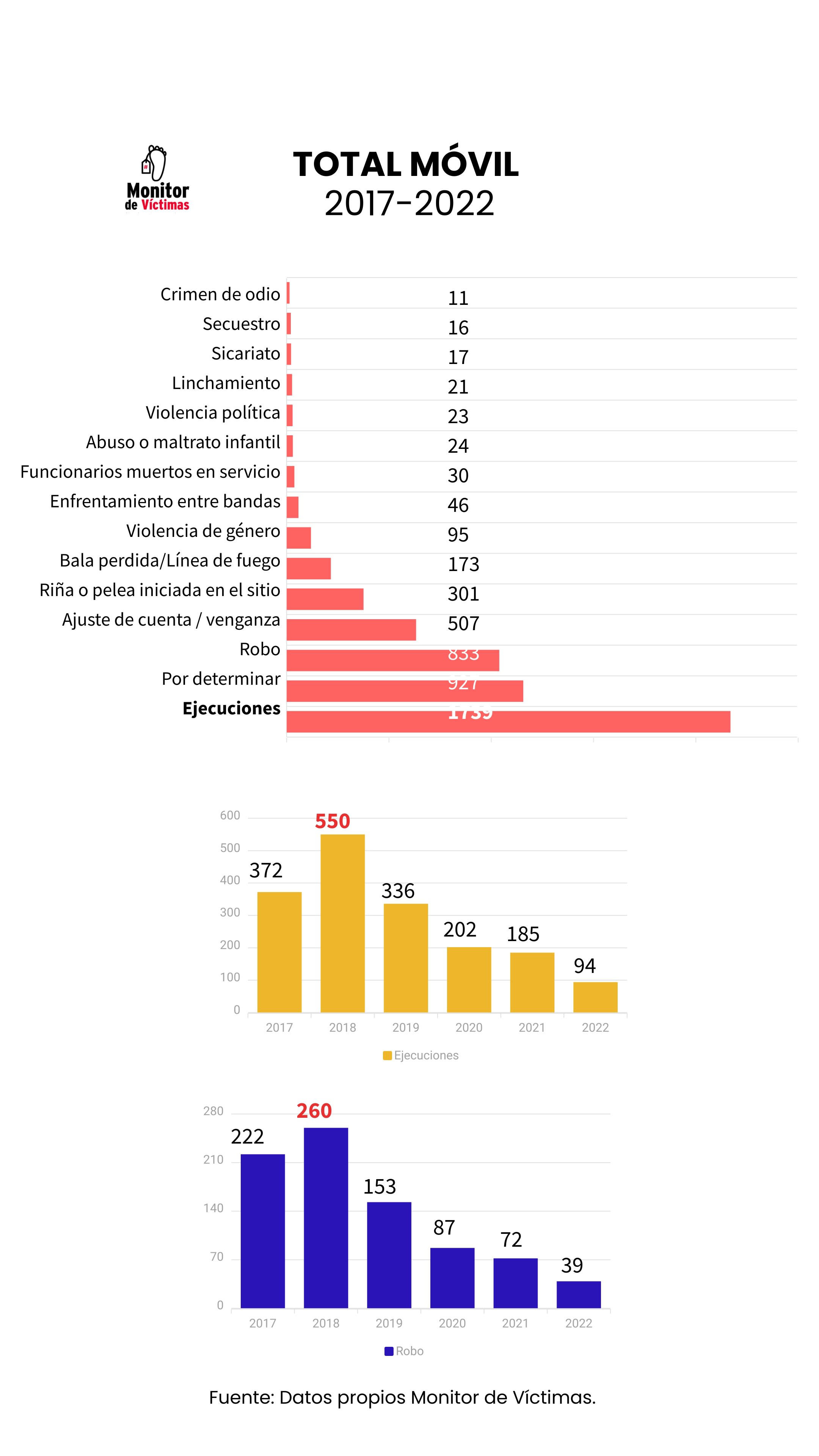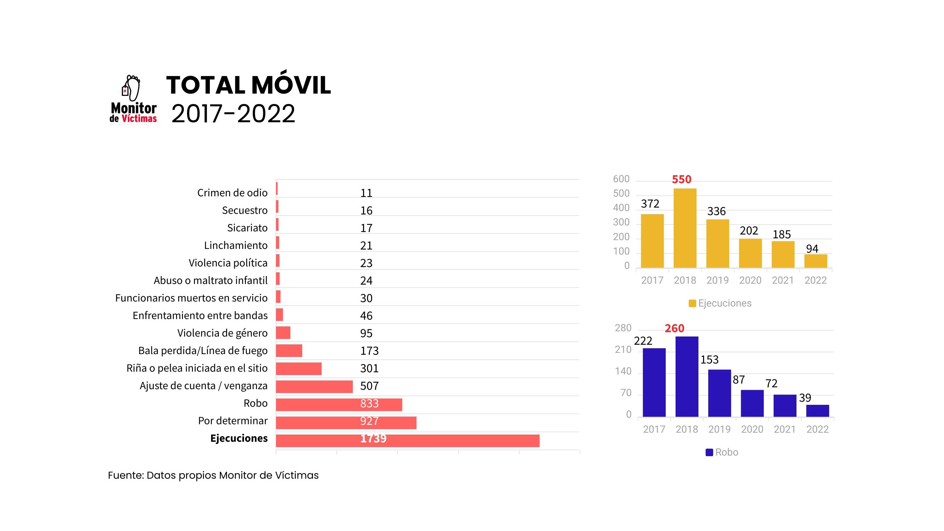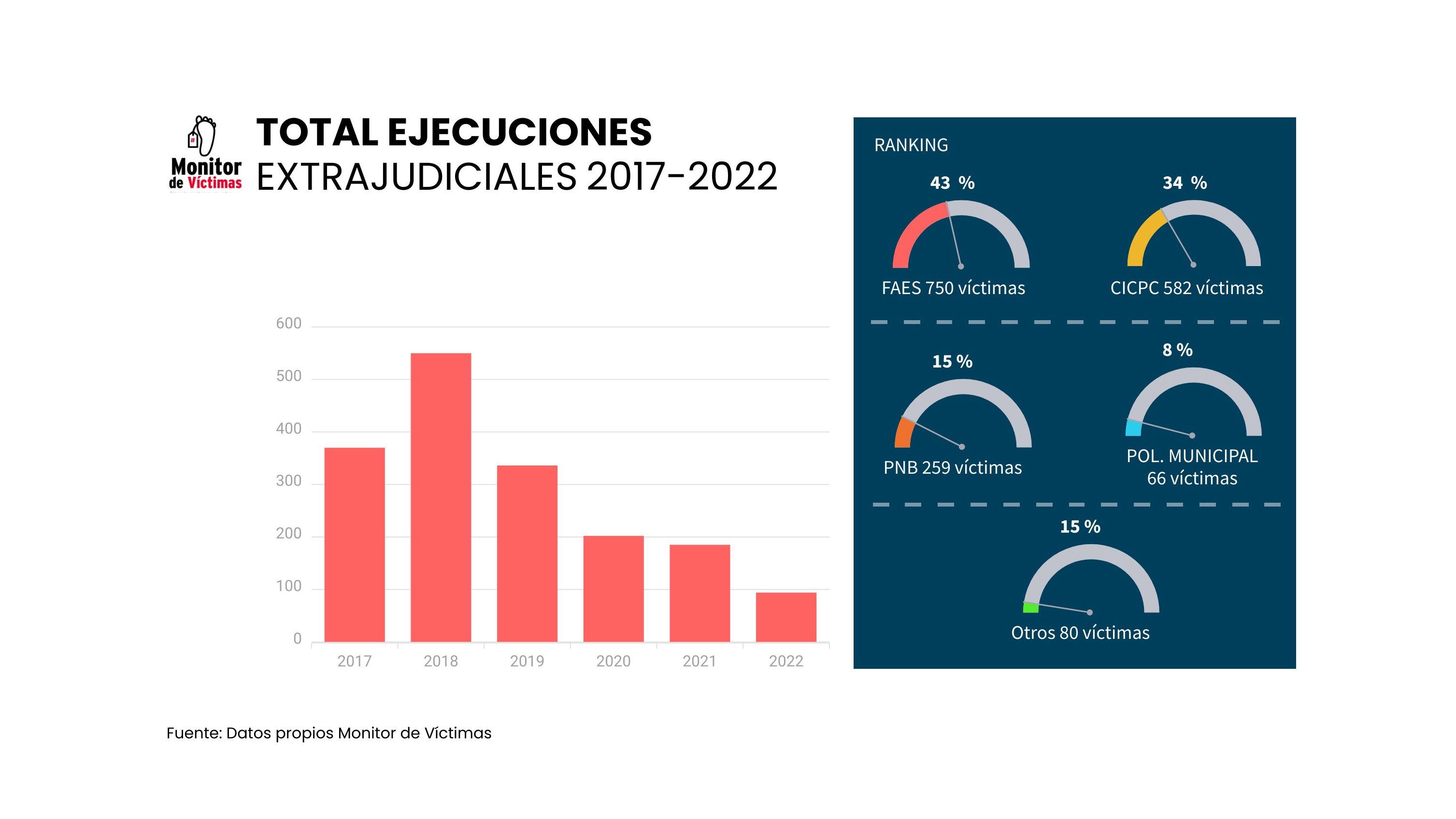 Desde 2017, Monitor de Víctimas comenzó a monitorear la violencia homicida en el Área Metropolitana de Caracas. A partir de ahí, se han añadido otros cuatro estados a nuestros registros: Lara (2020), Táchira (2021), Sucre (2022) y Zulia (2022). De esta forma, entre mayo de 2017 y diciembre de 2022, Monitor de Víctimas ha logrado tener registradas un total de 5.556 muertes violentas en los estados ya mencionados, 2.061 (37%) de las cuales son asesinatos por letalidad policial, siendo, de lejos, el móvil de mayor frecuencia.