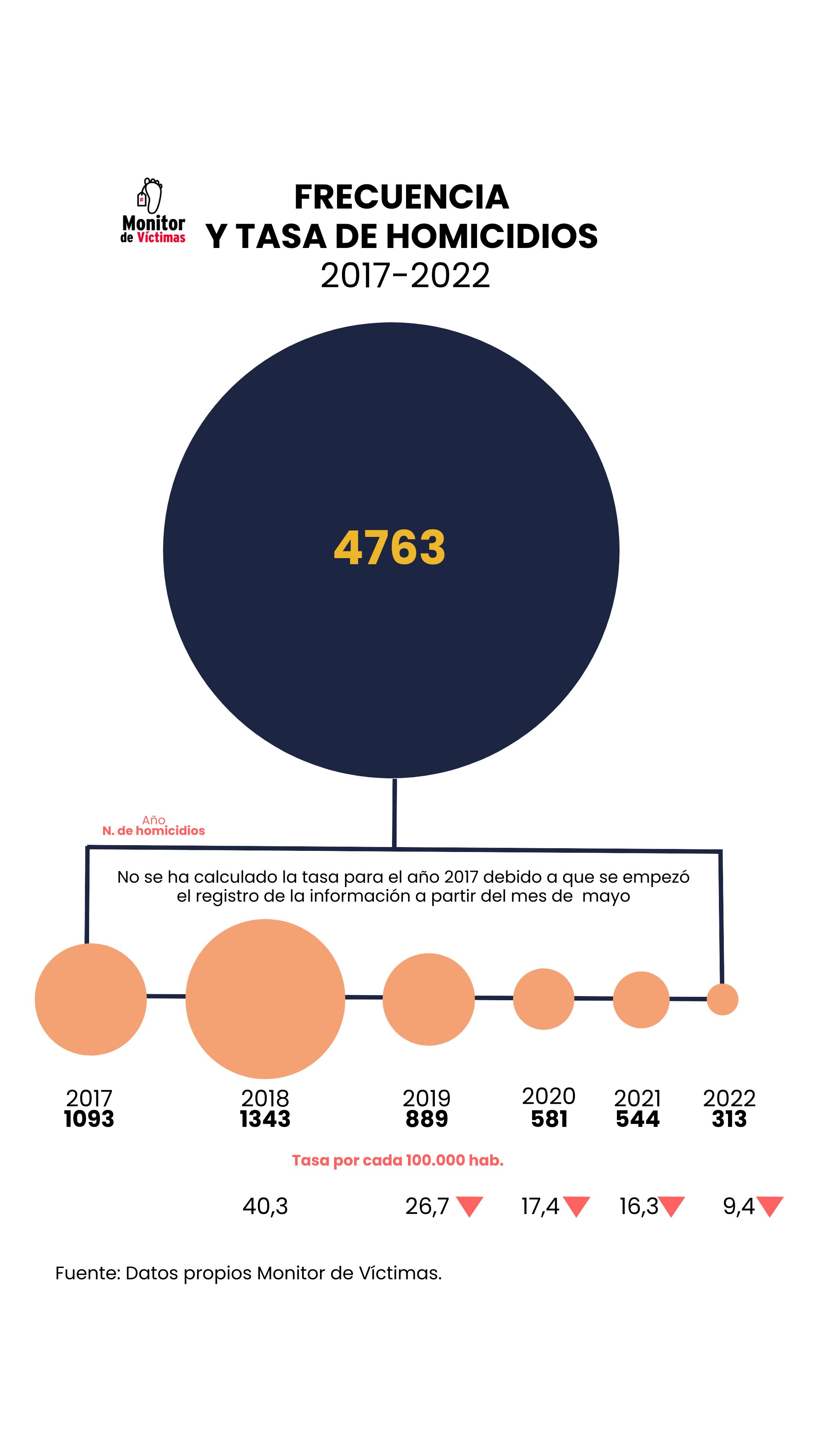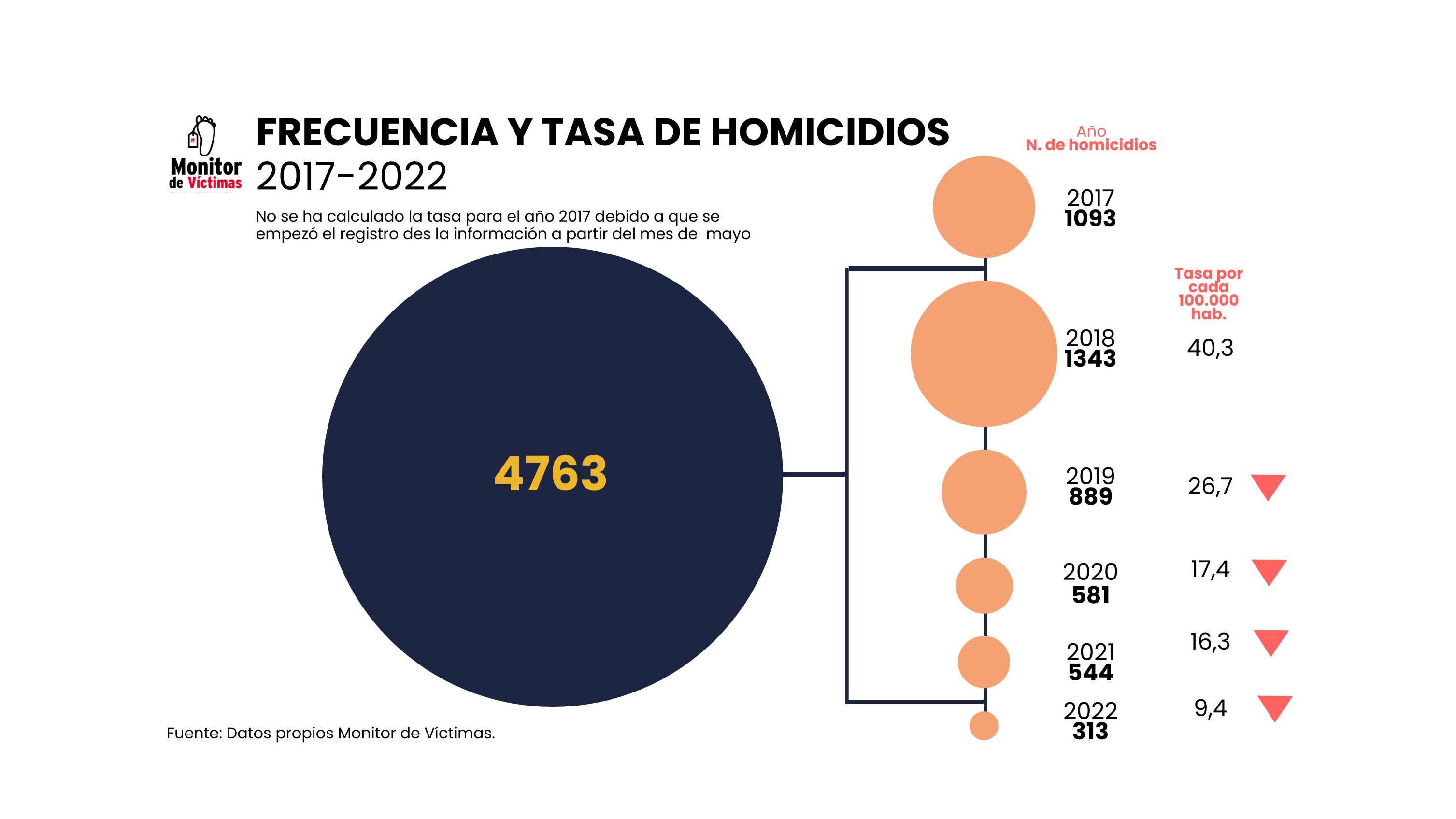 De igual forma, en la tabla 1 se puede observar el detalle de los lugares de ocurrencia de muertes violentas en la ciudad. Estas comunidades suman el 60% de los casos de muertes violentas registradas por Monitor de Víctimas entre 2017 y 2022.
