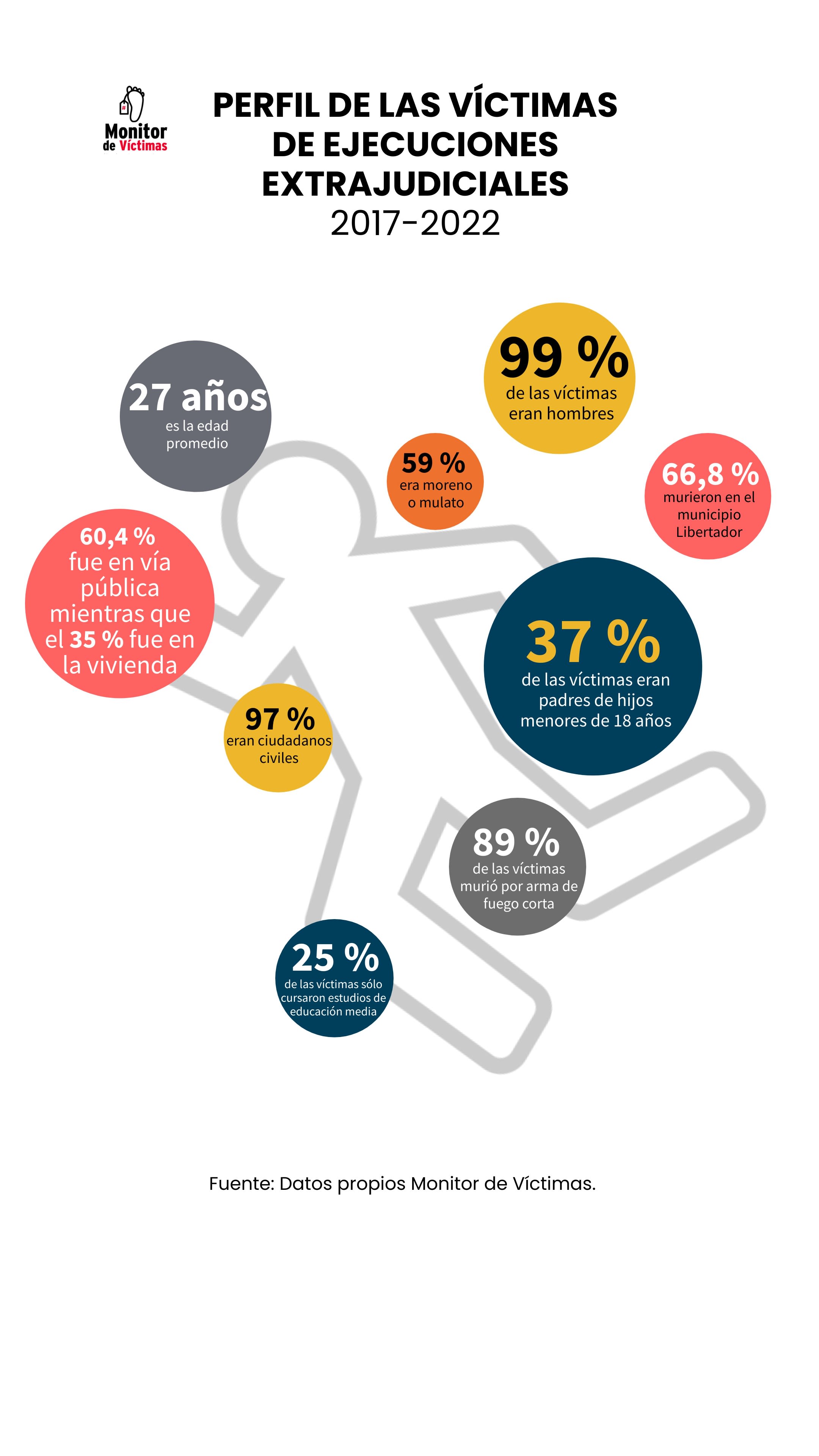 Entre 2017 y 2022, Monitor de Víctimas registró, a partir del testimonio de familiares de las víctimas, un total de 173 casos de balas perdidas en el Área Metropolitana de Caracas, lo que representa un 4% del total de casos en los que se cuenta con una causa de muerte registrada según los criterios de Monitor de Víctimas. Los años 2017 (26%), 2018 (28%) y 2021 (20%) fueron los que registraron el mayor número del total de muertes por balas perdidas de ese período.