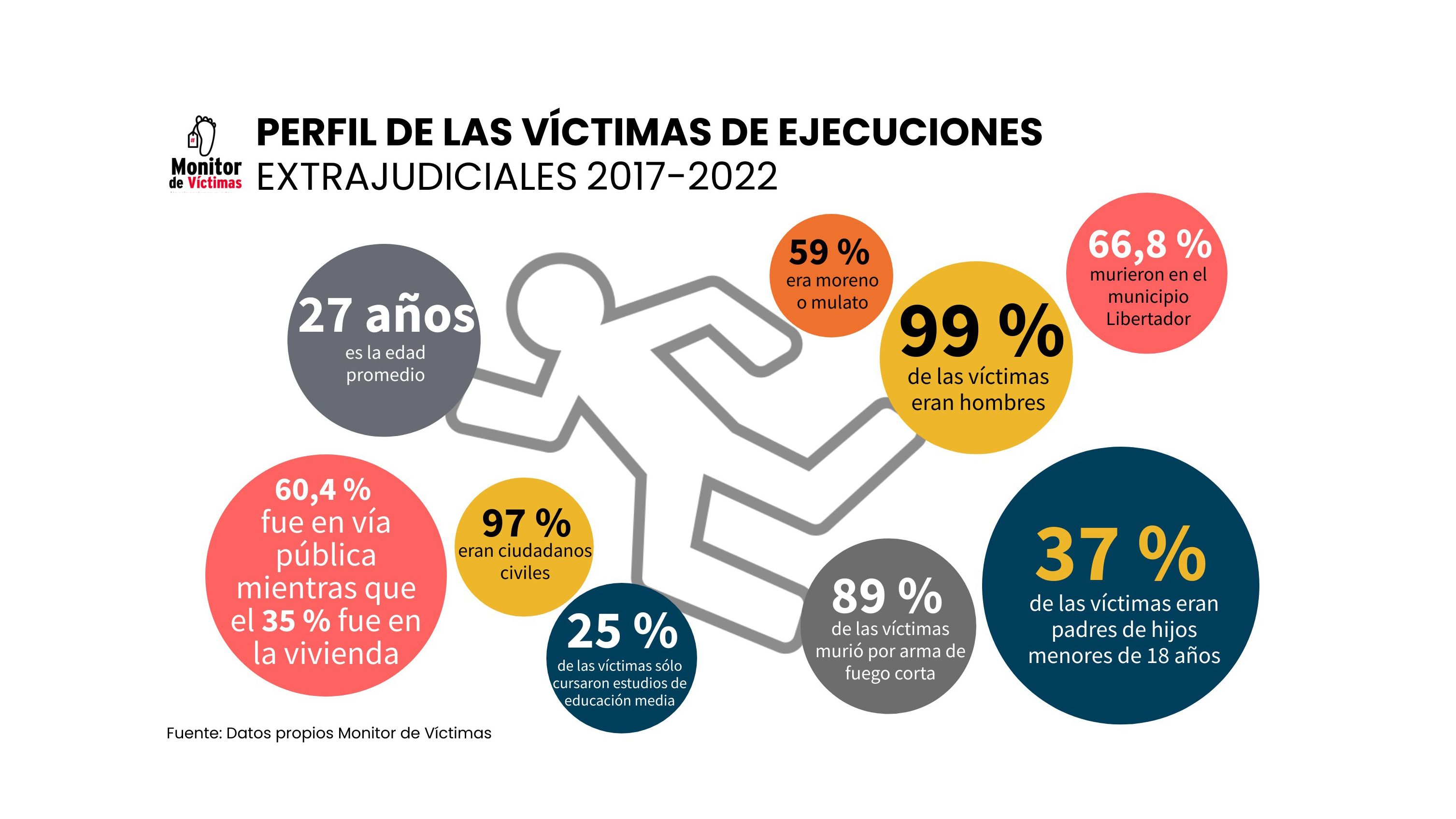 Además, es posible observar un claro patrón en las víctimas de ejecuciones extrajudiciales, homicidios que concentran una gran cantidad de hombres jóvenes. De esta forma, se tiene que de las 1182 víctimas de ejecuciones extrajudiciales registradas hasta 2022, un total de 1171 serían hombres, habiendo 10 víctimas en la población femenina.