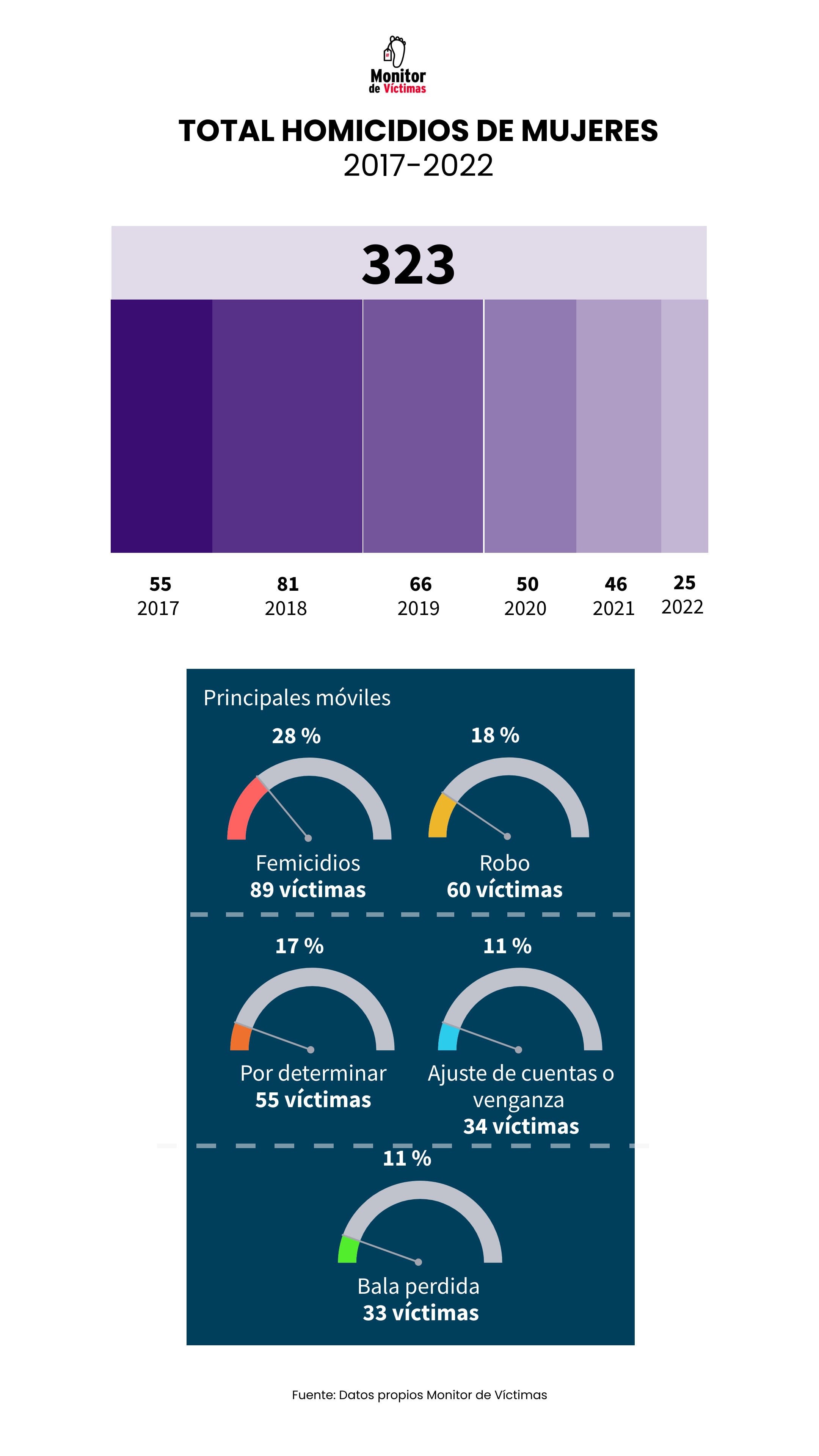 Asimismo, se tiene que de las muertes registradas entre 2017 y 2022 por balas perdidas, 82% ocurrieron en la vía pública, seguido por un 15% en la vivienda (en total,ambos lugares acumulan el 97% de los casos). De igual forma, es interesante destacar que en el 12% de los casos registrados por Monitor de Víctimas hubo más de una víctima fallecida, por dicha causa, en la misma familia.