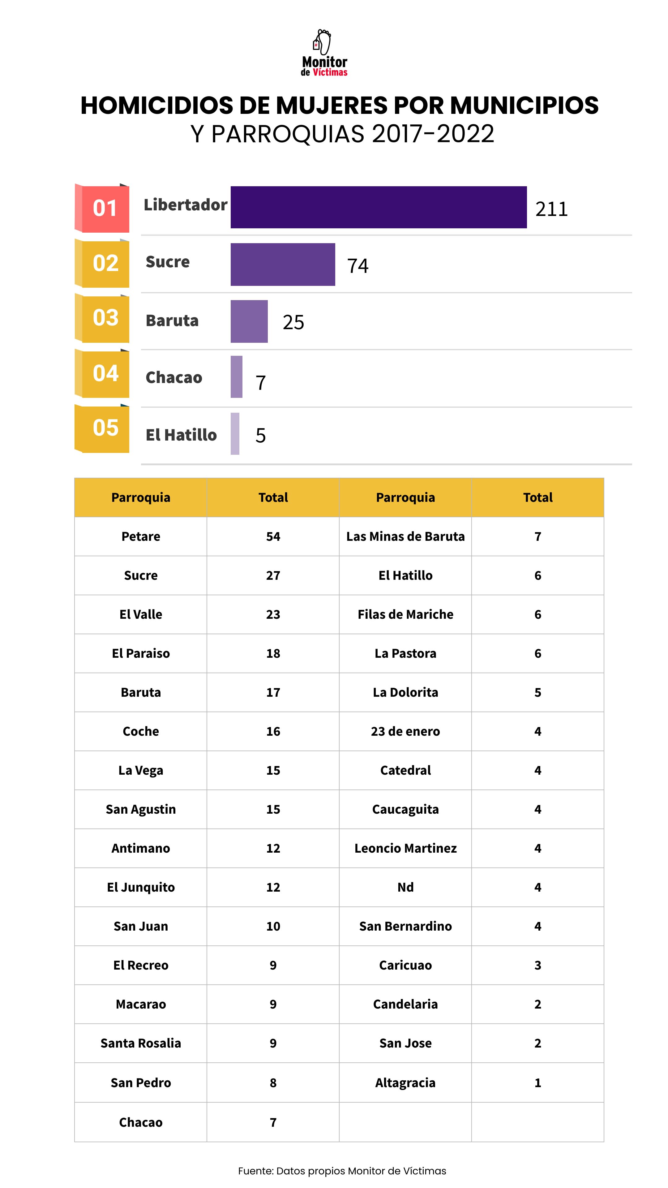 En principio se tiene que los casos registrados en Monitor de Víctimas contemplan el Distrito Capital y municipios seleccionados de Miranda (Baruta, El Hatillo, Chacao y Sucre). Entre las parroquias con mayor ocurrencia de muertes violentas entre 2017 y 2002 se tienen a Petare, Sucre, El Valle, Coche, Antímano y La Vega. Es importante resaltar que las parroquias Petare y Sucre suman casi el 30% de las muertes violentas registradas por Monitor de Víctimas en el período estudiado.