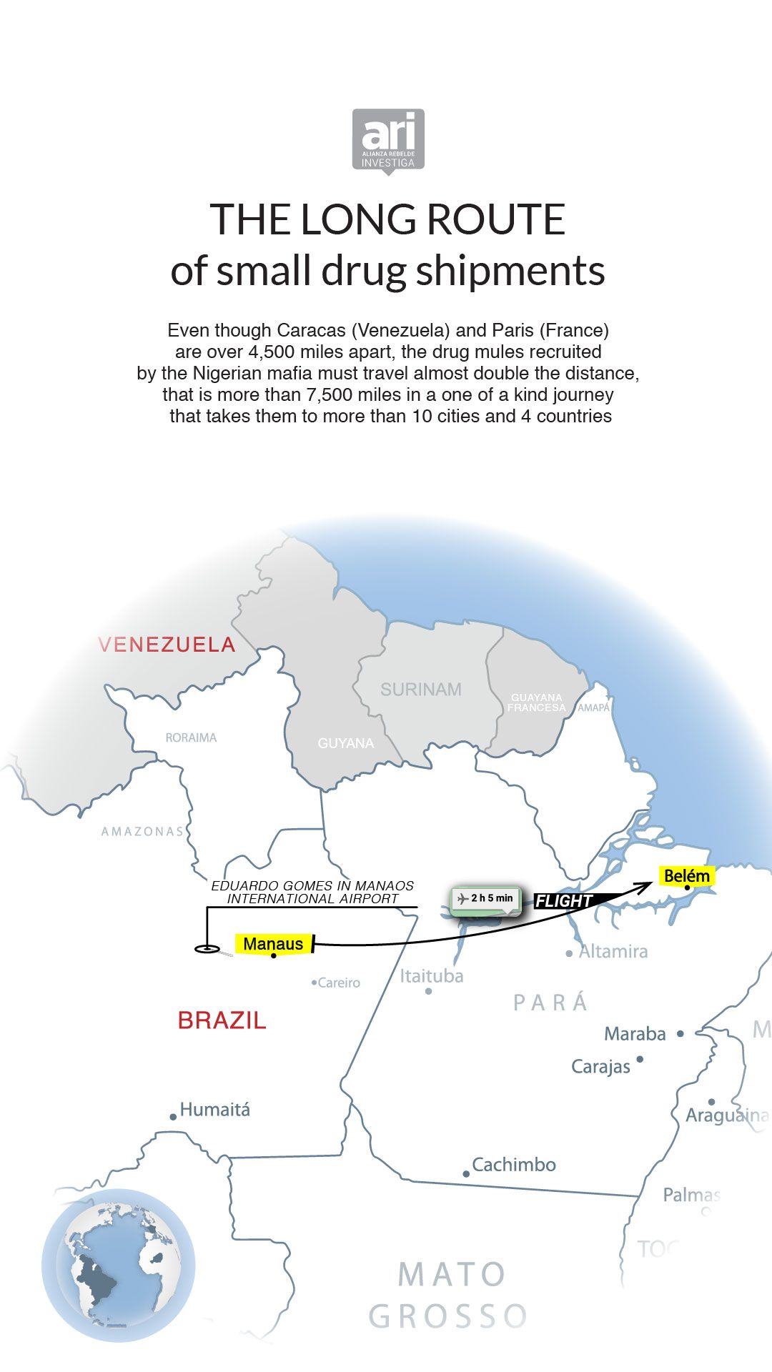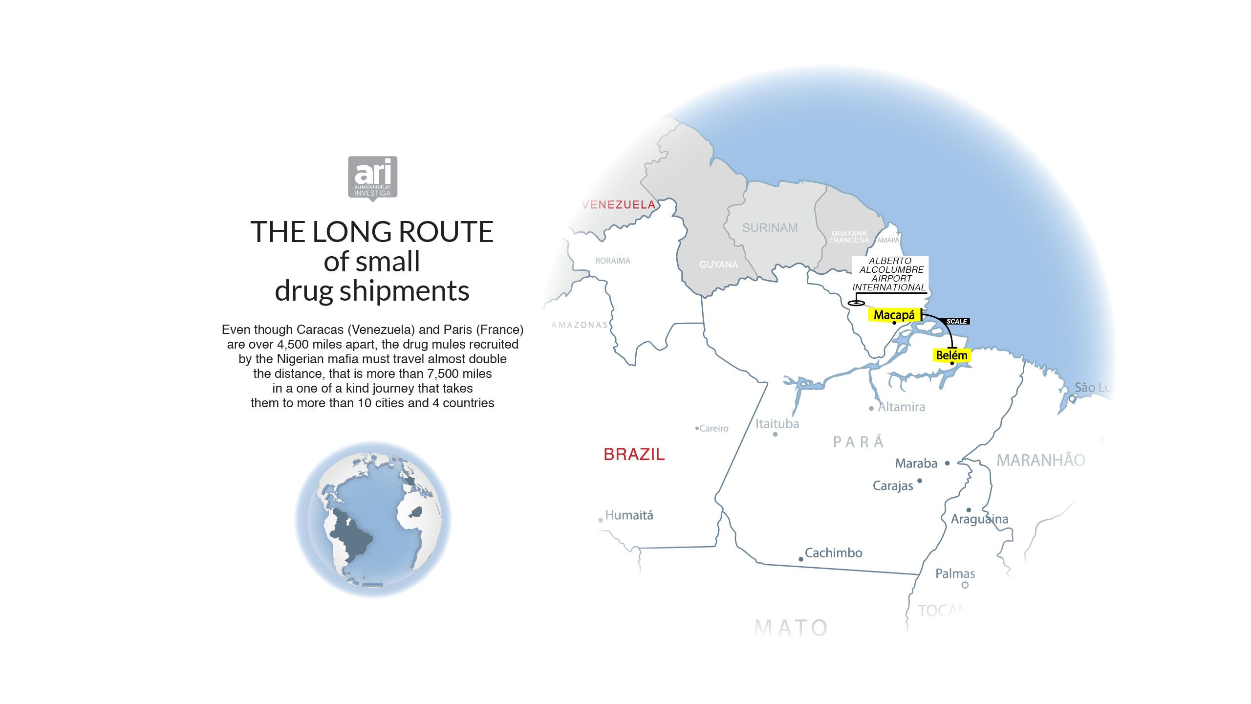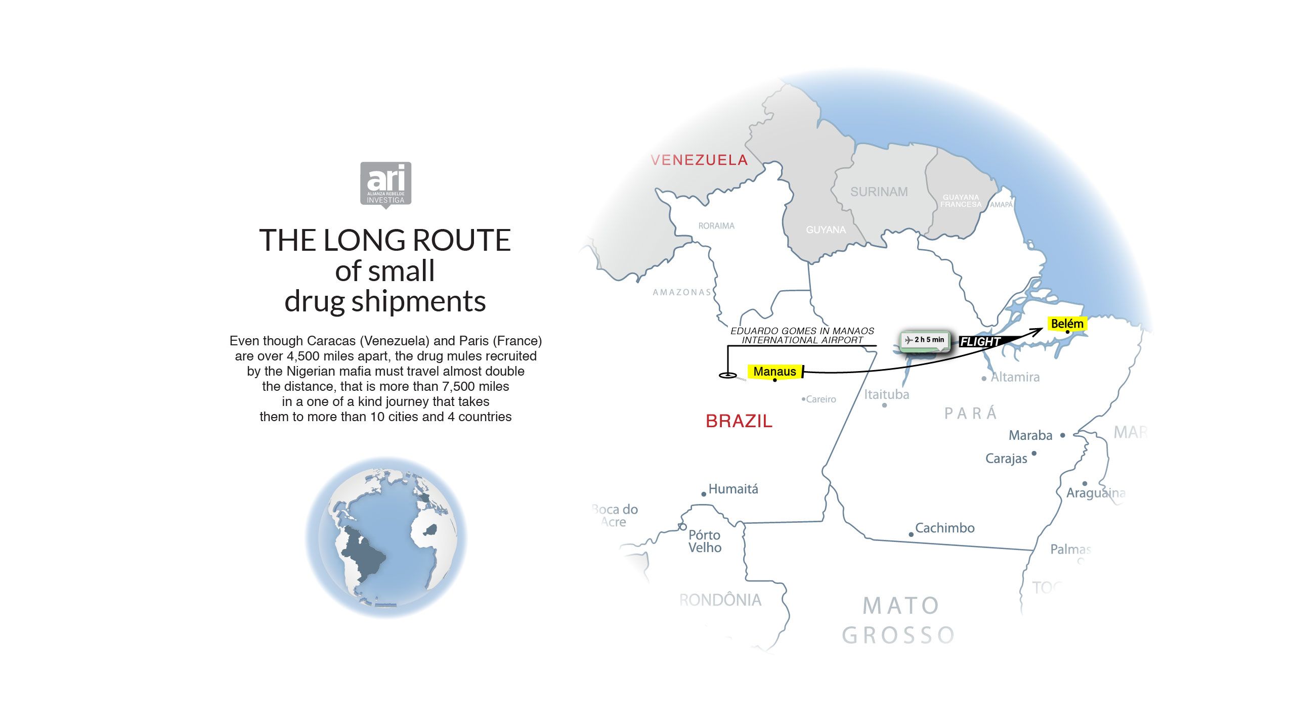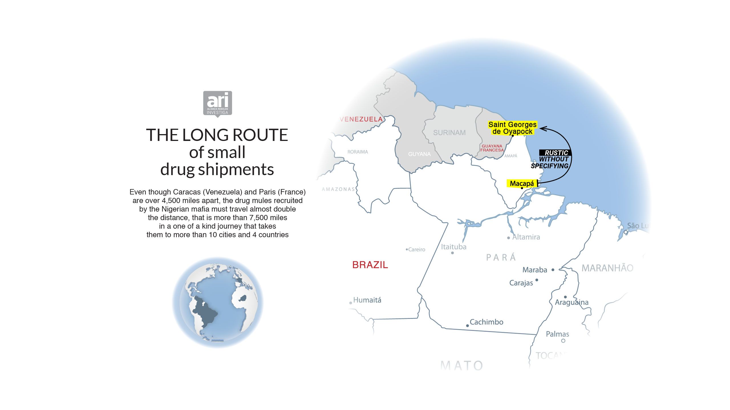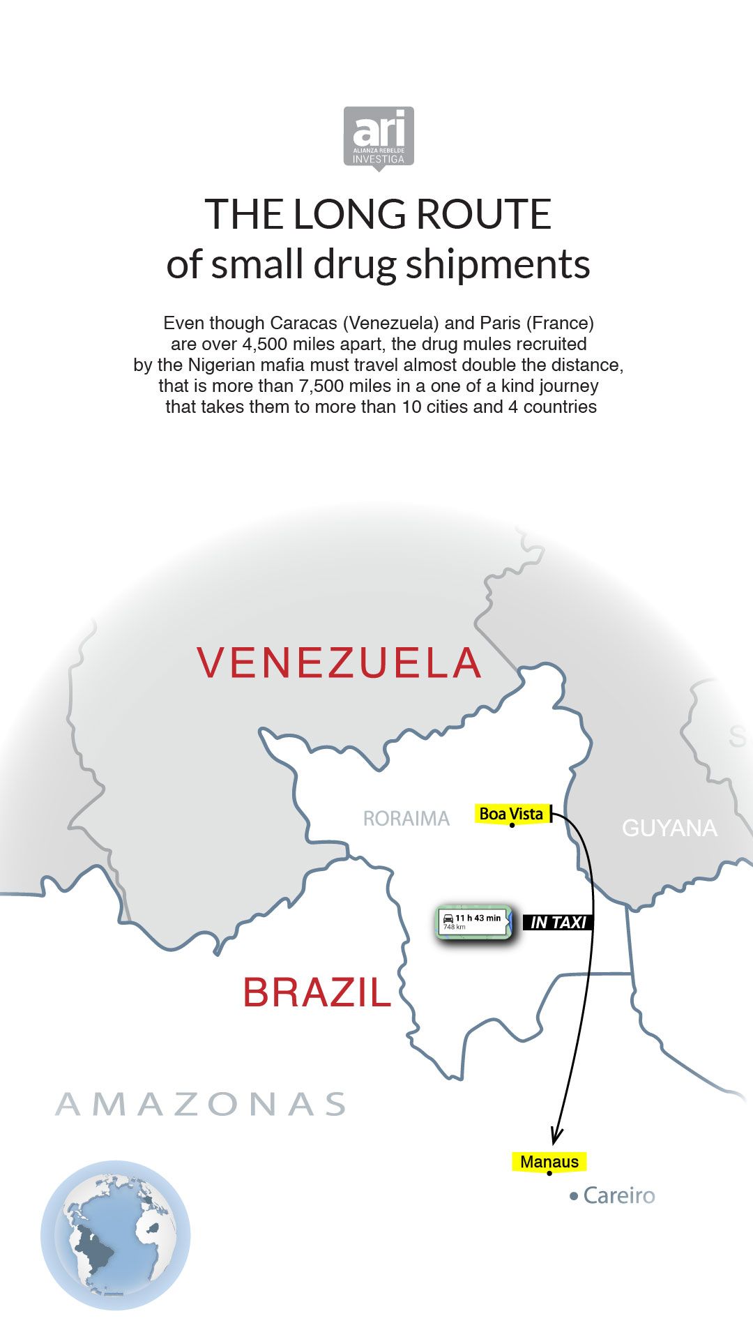 For this investigation, the ARI team had access to Alba’s file. According to her account to the police, the Nigerian owner of the hotel where she stayed proposed her to travel to France carrying cocaine capsules in her stomach. The journey included the departure by bus from Boa Vista, followed by a stop in Manaus (in the Brazilian state of Amazonas), then a flight to Belém (in the Brazilian state of Pará) where she would cross to French Guiana, and then the final flight to Paris, France.