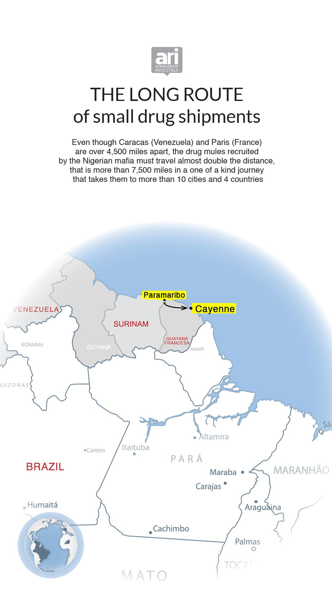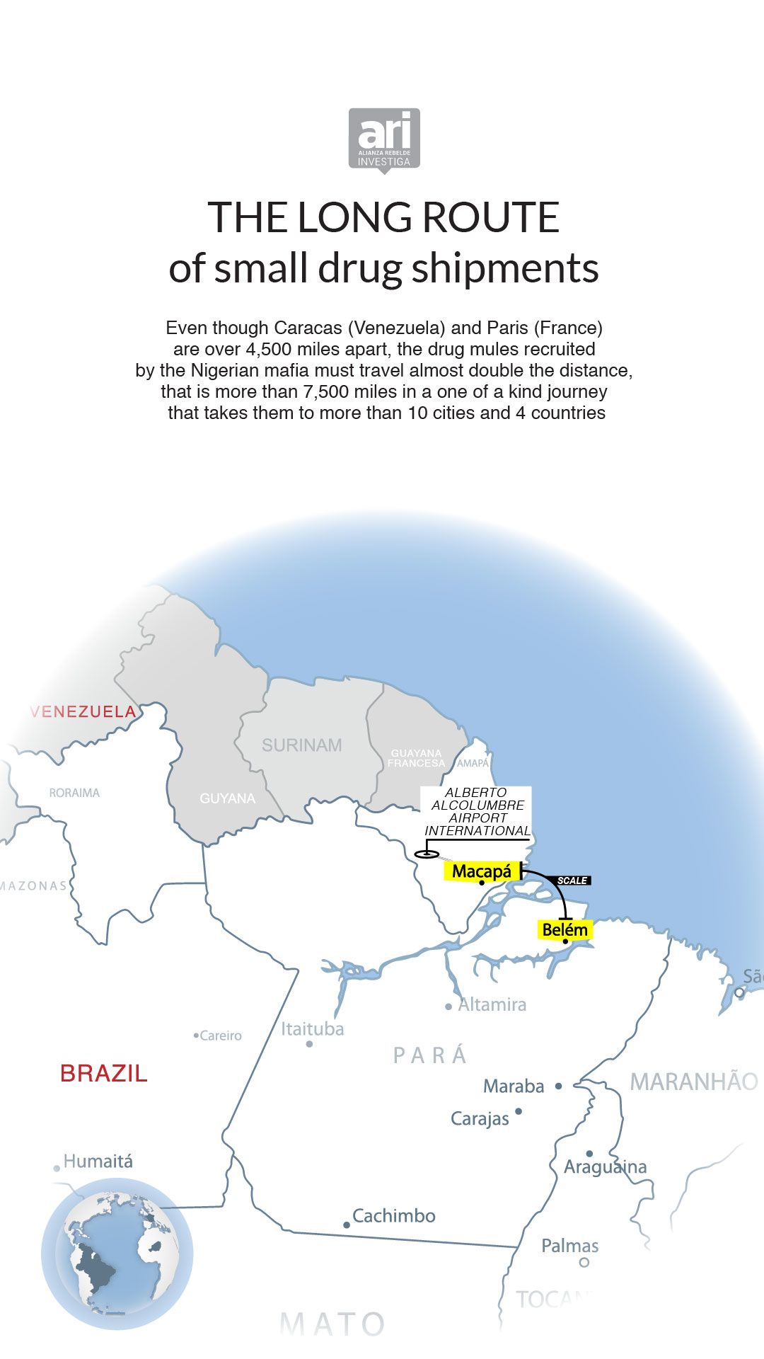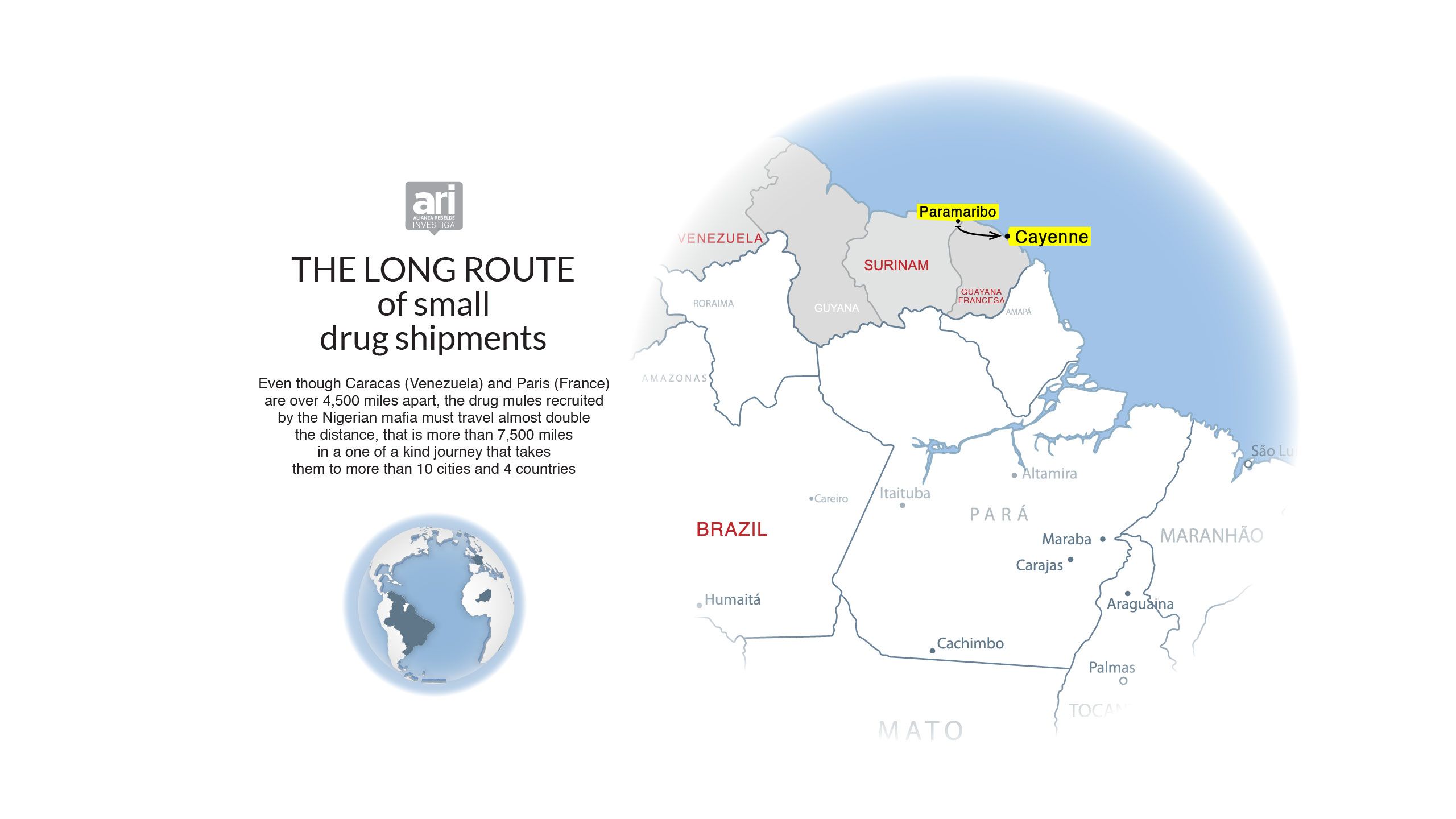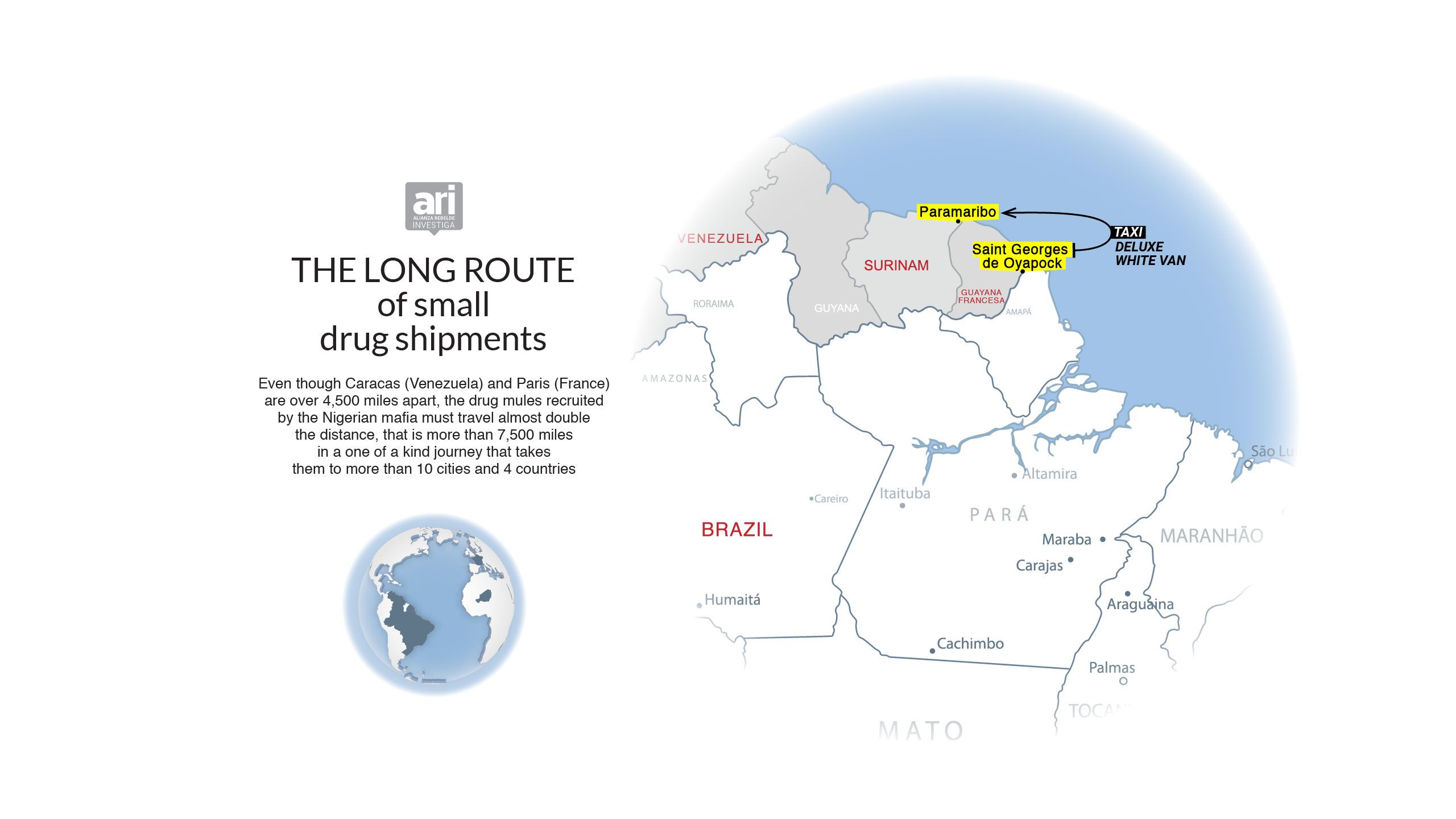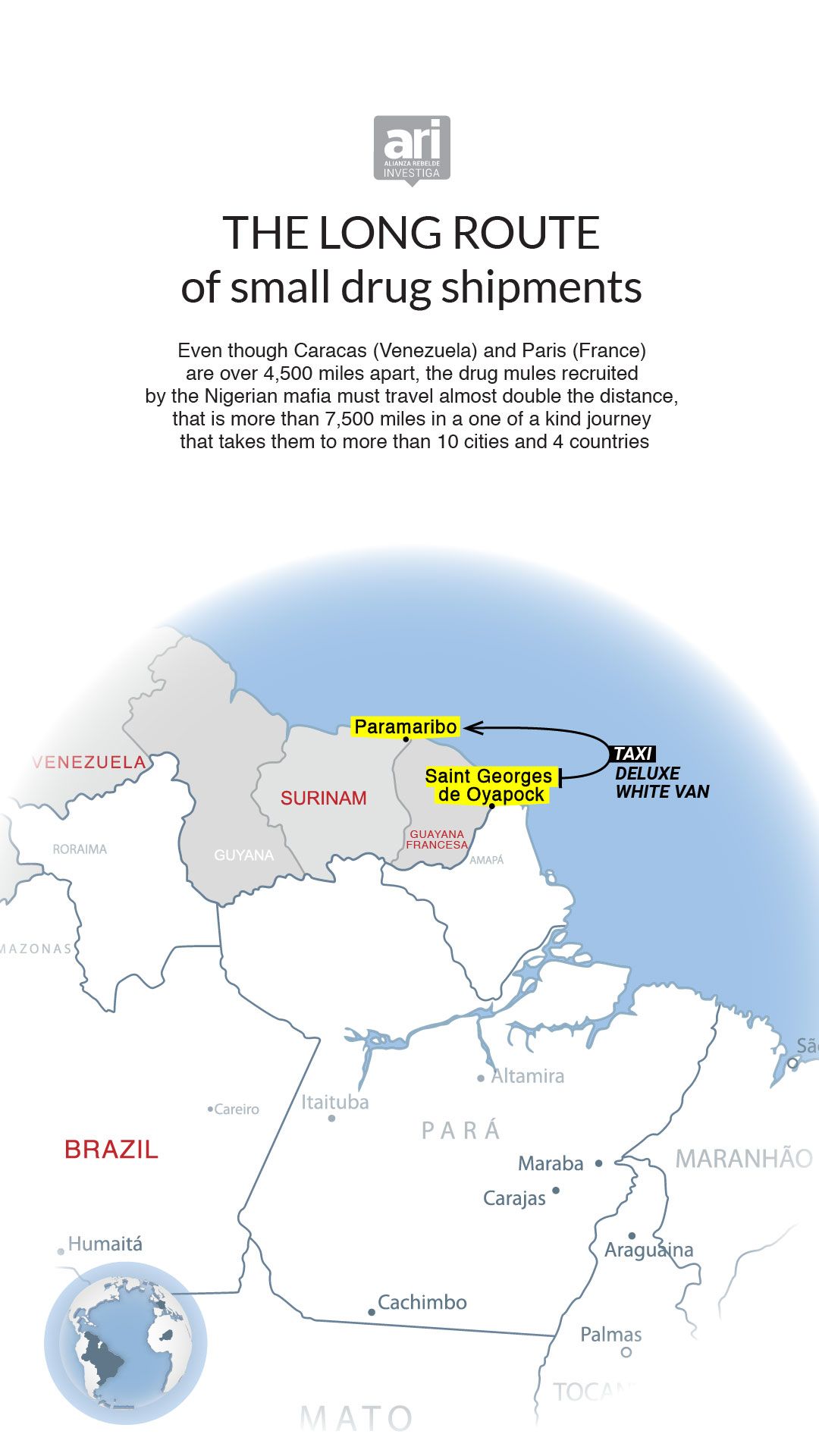 For this investigation, the ARI team had access to Alba’s file. According to her account to the police, the Nigerian owner of the hotel where she stayed proposed her to travel to France carrying cocaine capsules in her stomach. The journey included the departure by bus from Boa Vista, followed by a stop in Manaus (in the Brazilian state of Amazonas), then a flight to Belém (in the Brazilian state of Pará) where she would cross to French Guiana, and then the final flight to Paris, France.