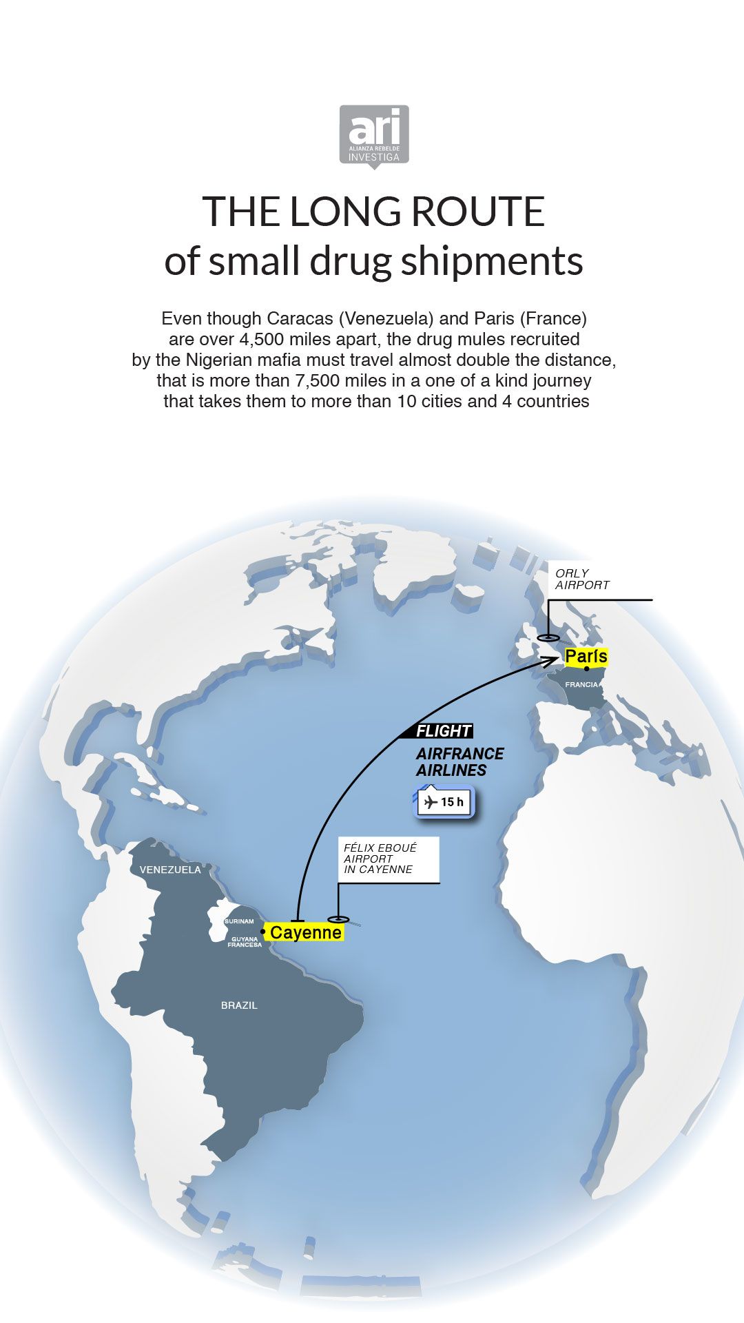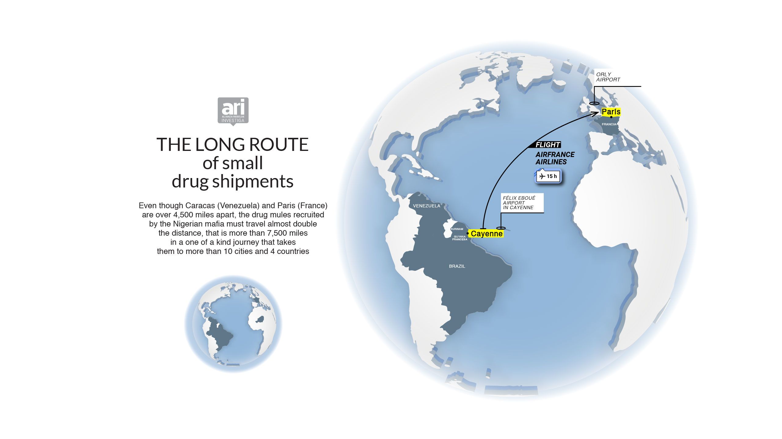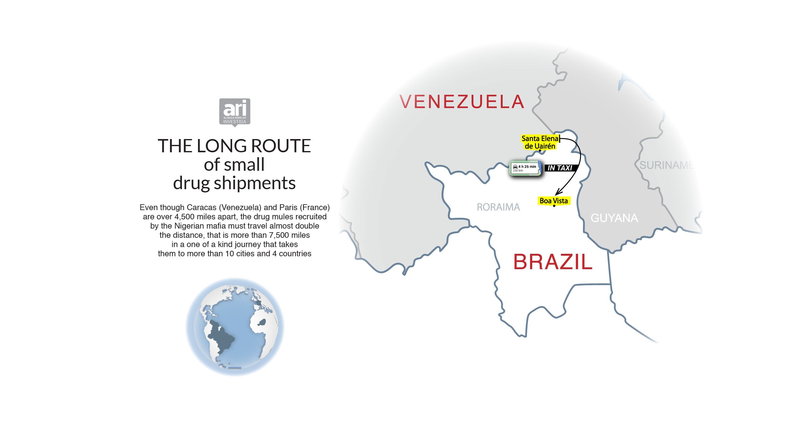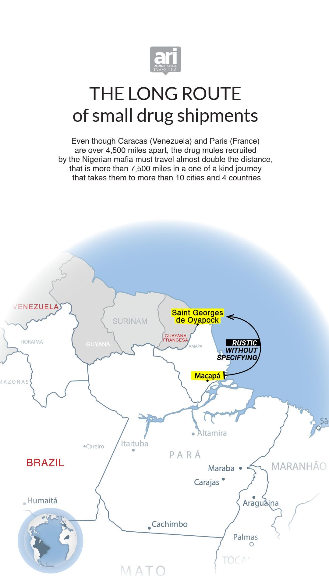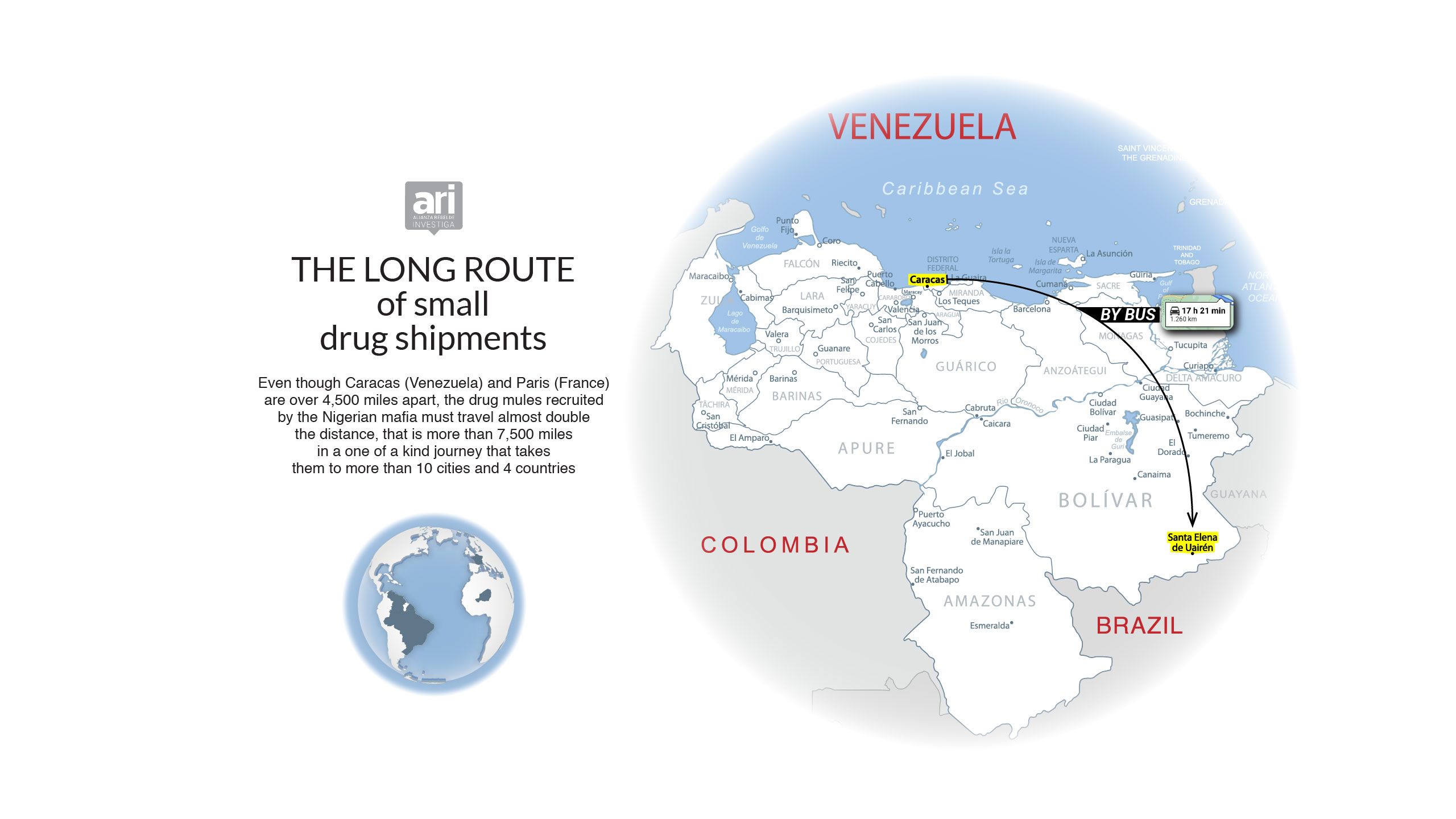 For this investigation, the ARI team had access to Alba’s file. According to her account to the police, the Nigerian owner of the hotel where she stayed proposed her to travel to France carrying cocaine capsules in her stomach. The journey included the departure by bus from Boa Vista, followed by a stop in Manaus (in the Brazilian state of Amazonas), then a flight to Belém (in the Brazilian state of Pará) where she would cross to French Guiana, and then the final flight to Paris, France.
