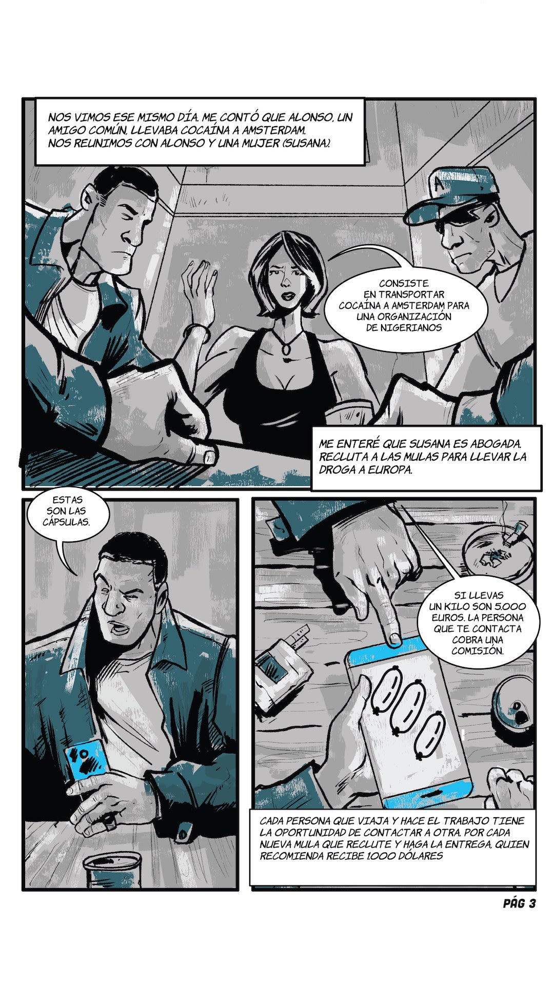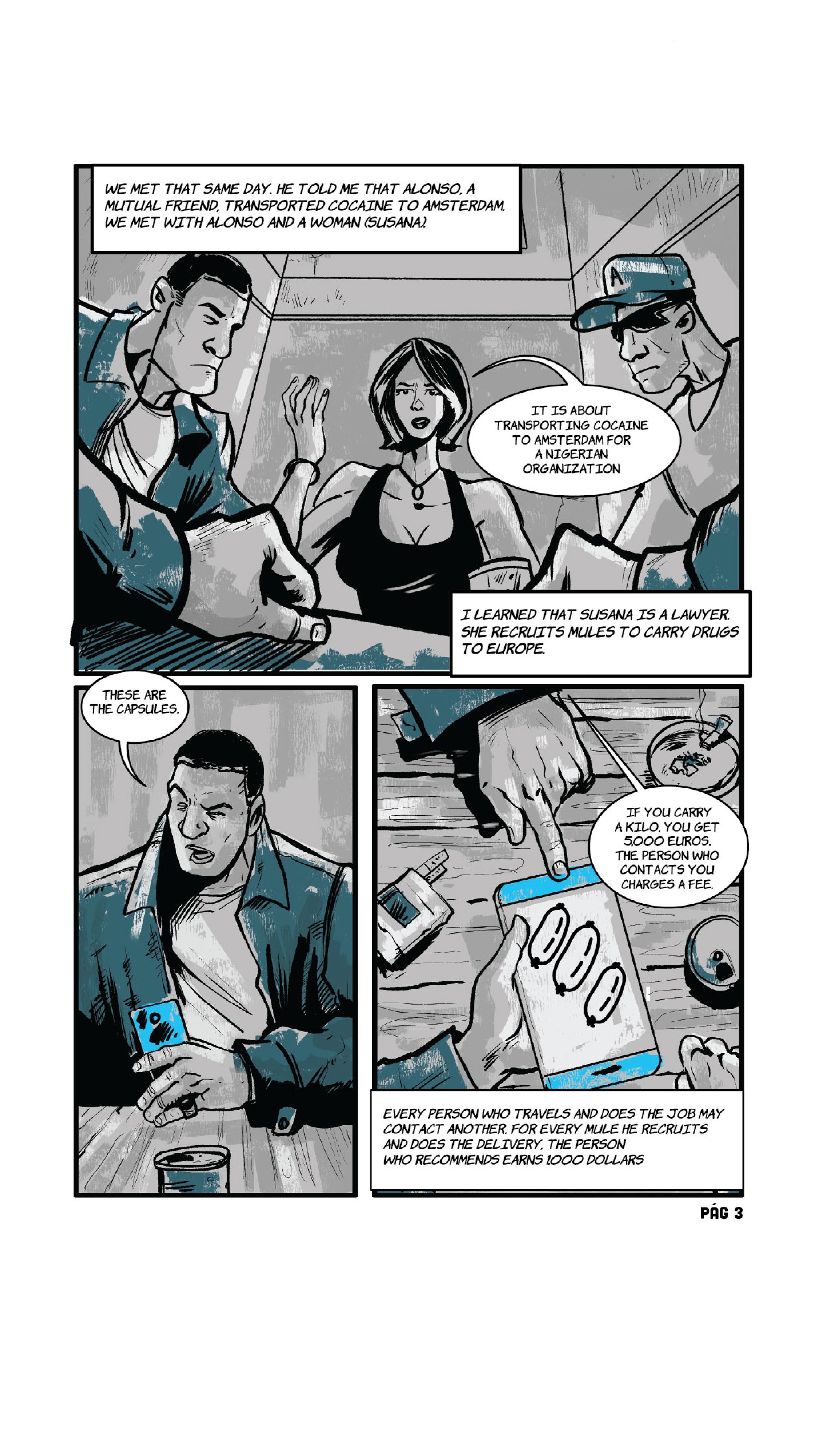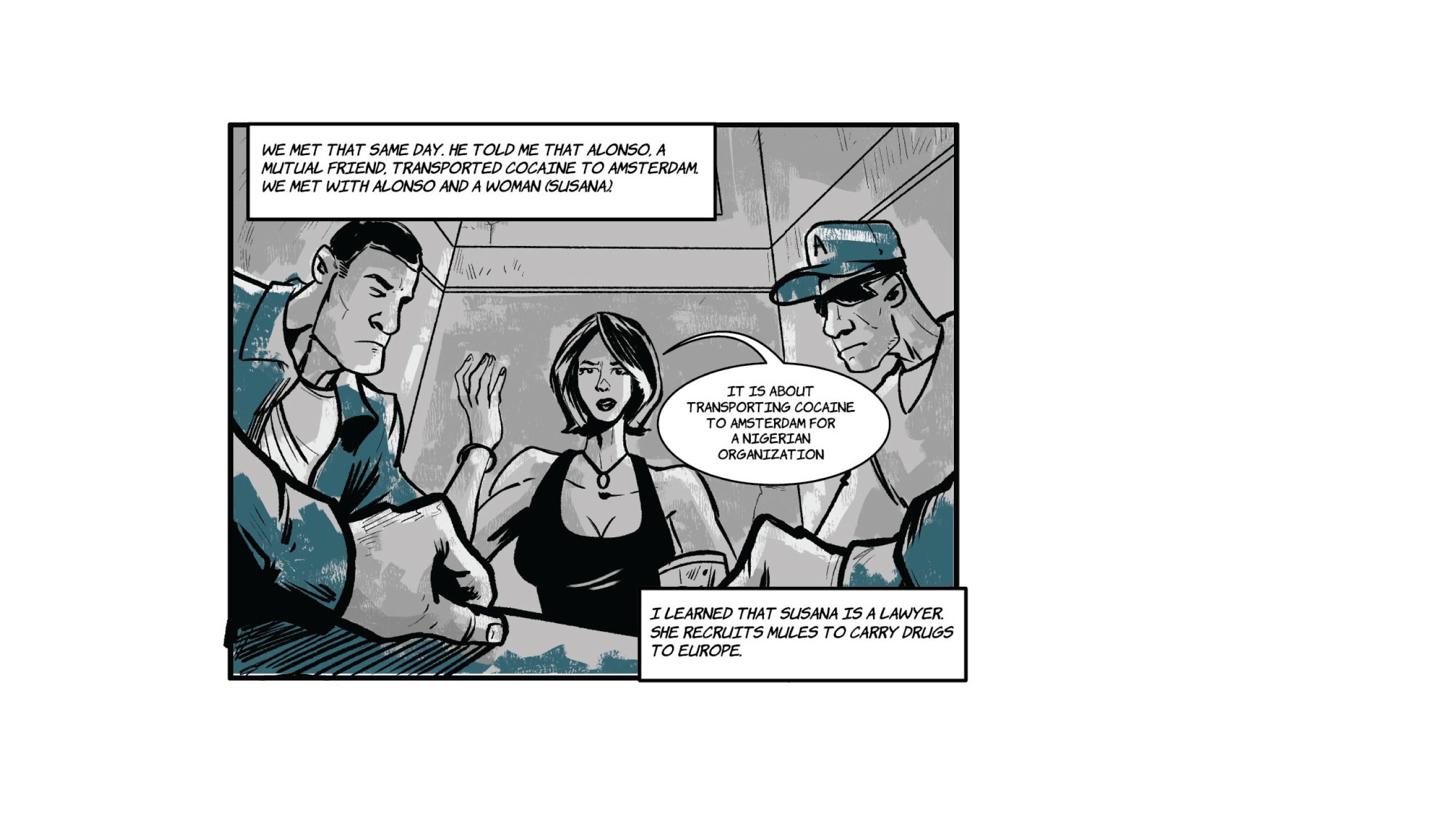 Susana is in charge of recruiting people to use as cocaine "mules". She is the one who communicates directly with the heads of the African network that has branches in Venezuela, Brazil, French Guiana, Suriname, and Europe.