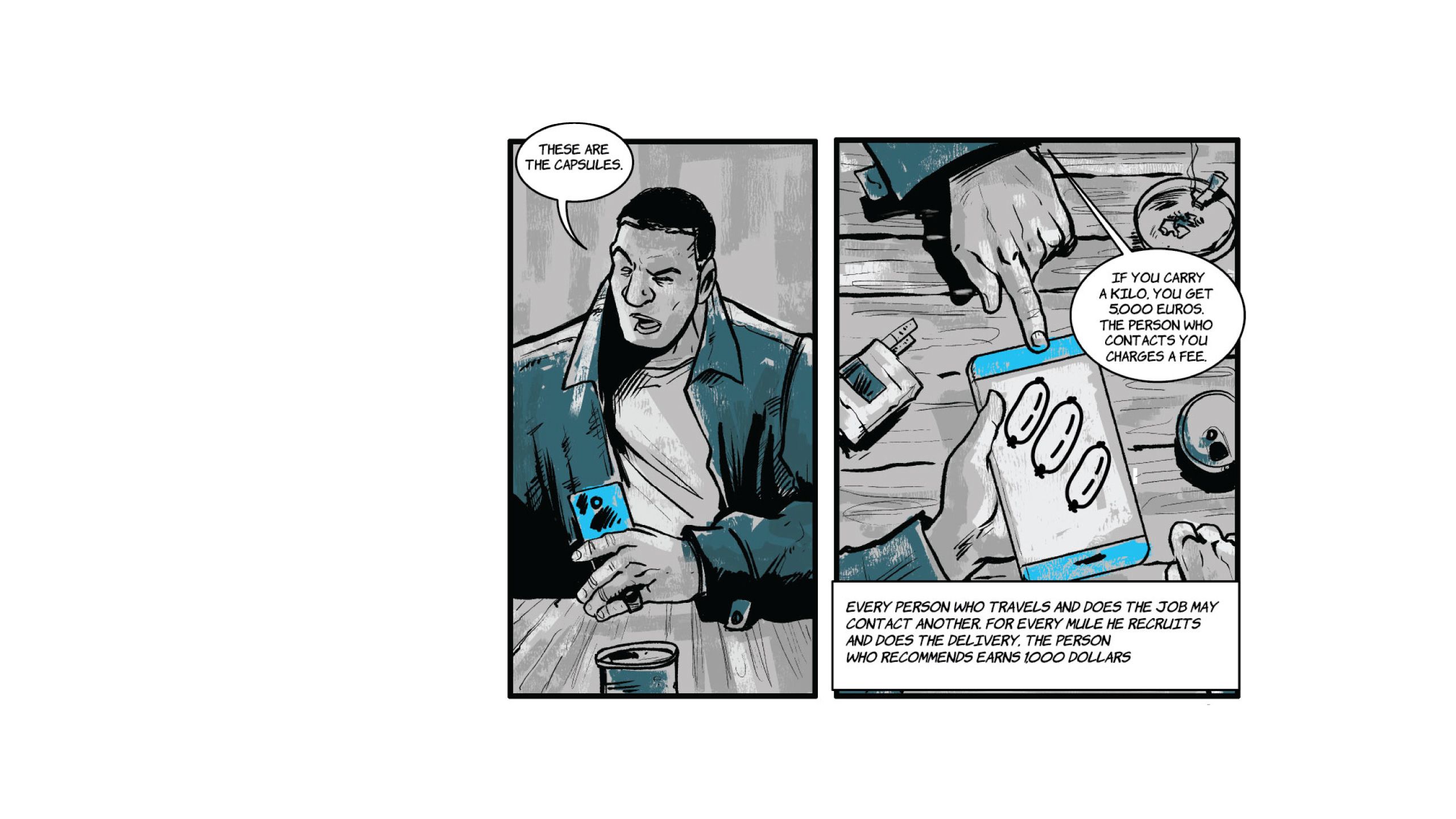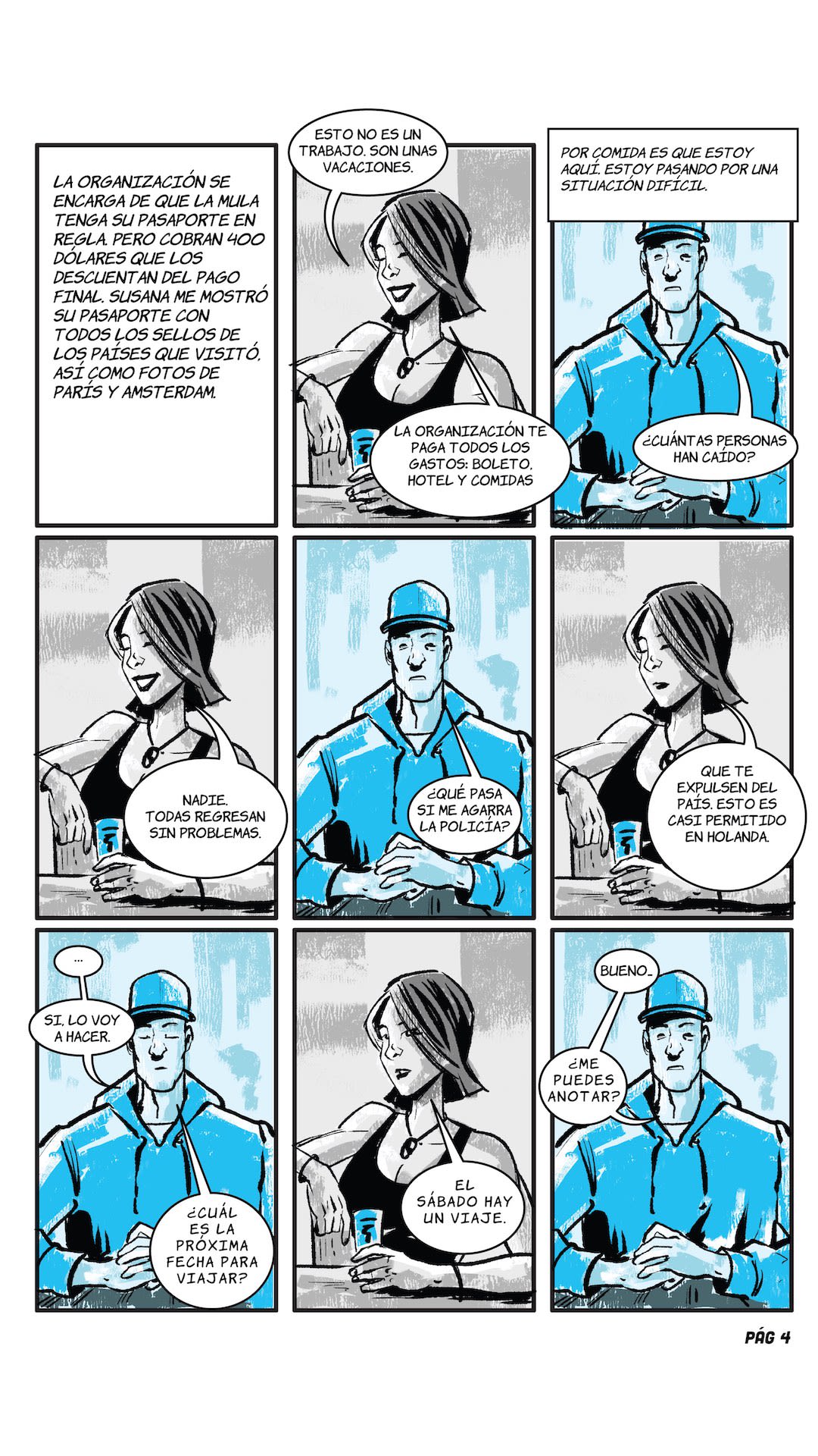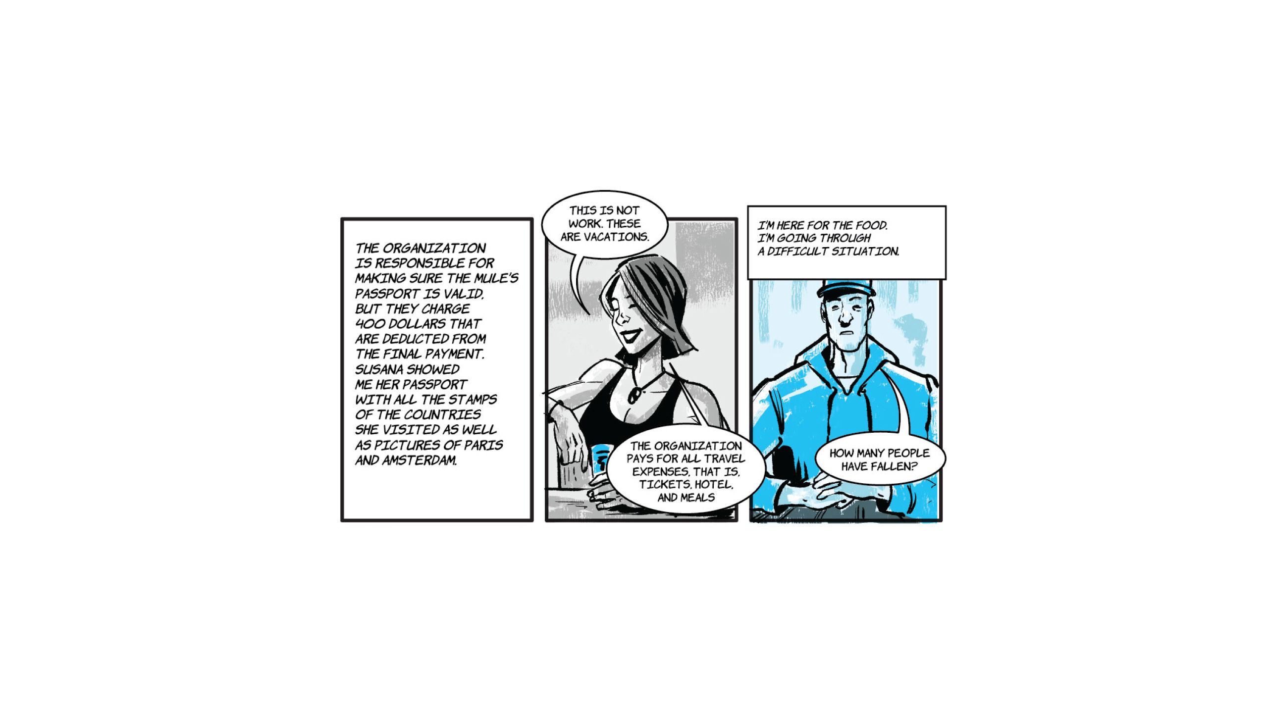 Susana is in charge of recruiting people to use as cocaine "mules". She is the one who communicates directly with the heads of the African network that has branches in Venezuela, Brazil, French Guiana, Suriname, and Europe.