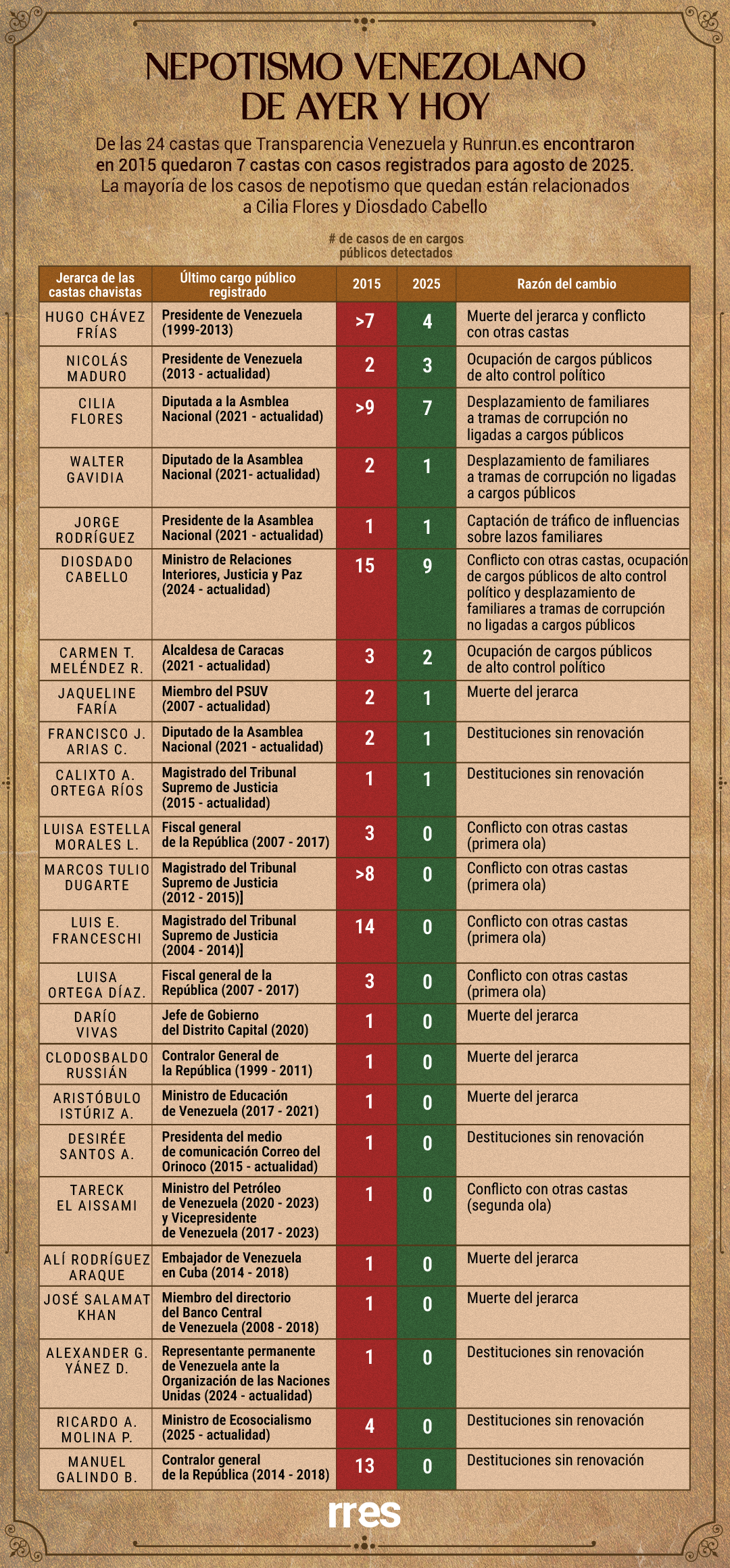 De las 24 castas que Transparencia Venezuela y Runrun.es encontraron en 2015 quedaron siete castas con casos registrados para agosto de 2025. La mayoría de los casos de nepotismo que quedan están relacionados a Cilia Flores, Nicolás Maduro y Diosdado Cabello, ya sea por tráfico de influencia o por vínculos familiares.
